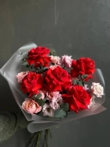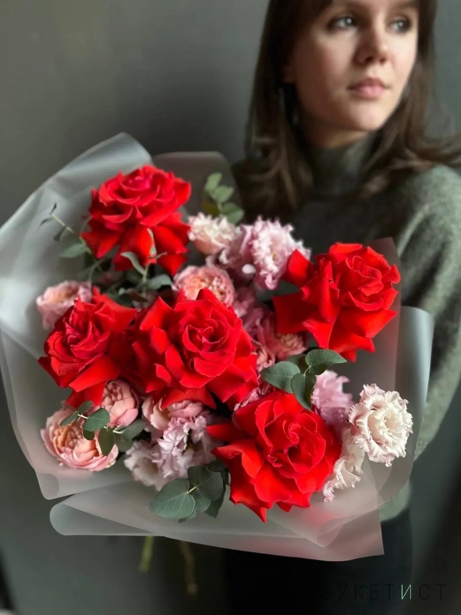 Яркий авторский букет из алых ажурных роз сорта Нина, персиковой пионовидной розы сорта Джульетта и кружевной эустомы . Этот букет — про сочность, эмоции и продуманную гармонию форм и оттенков. Он выглядит объёмно, но при этом остаётся лёгким и изящным, благодаря удачному сочетанию фактур и цветов. Прелесть, не правда ли?