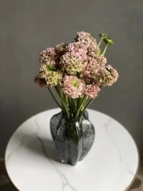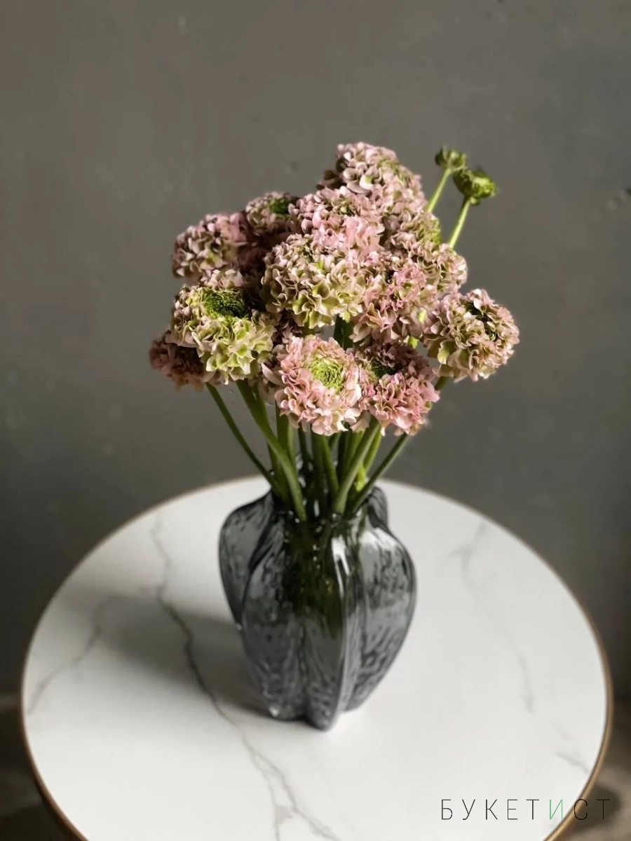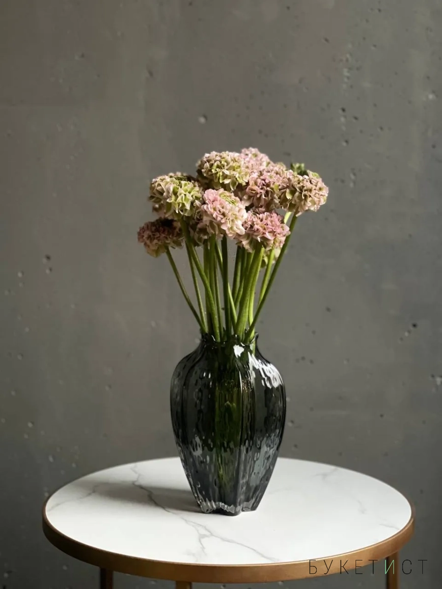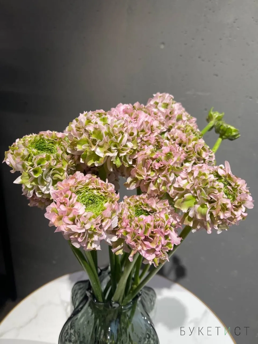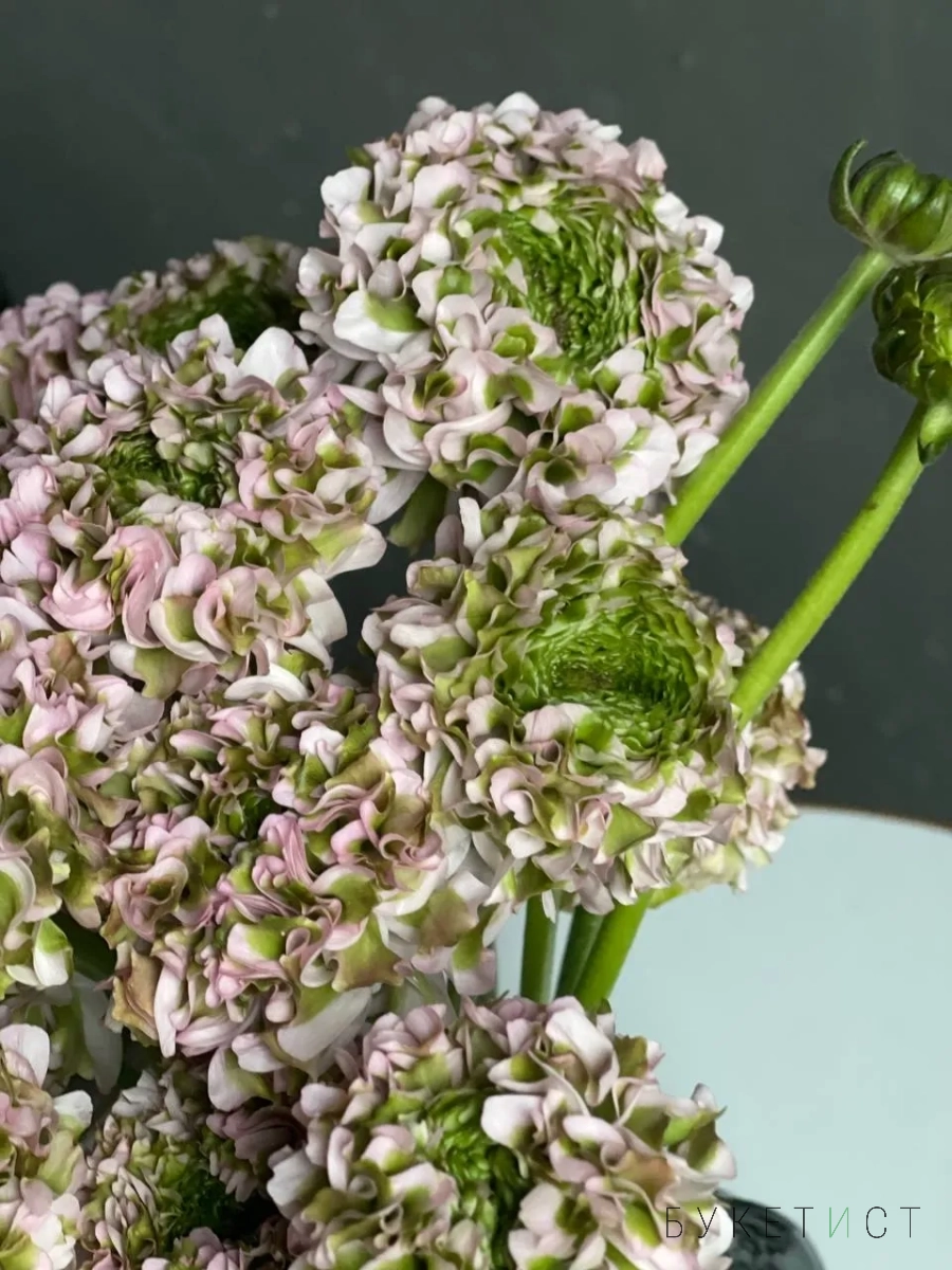 Букет необычных зелено-розовых ажурных ранунклюсов. На фото представлен букет из 15 стеблей.