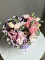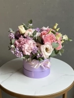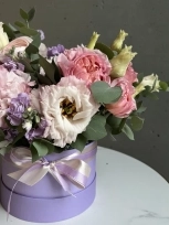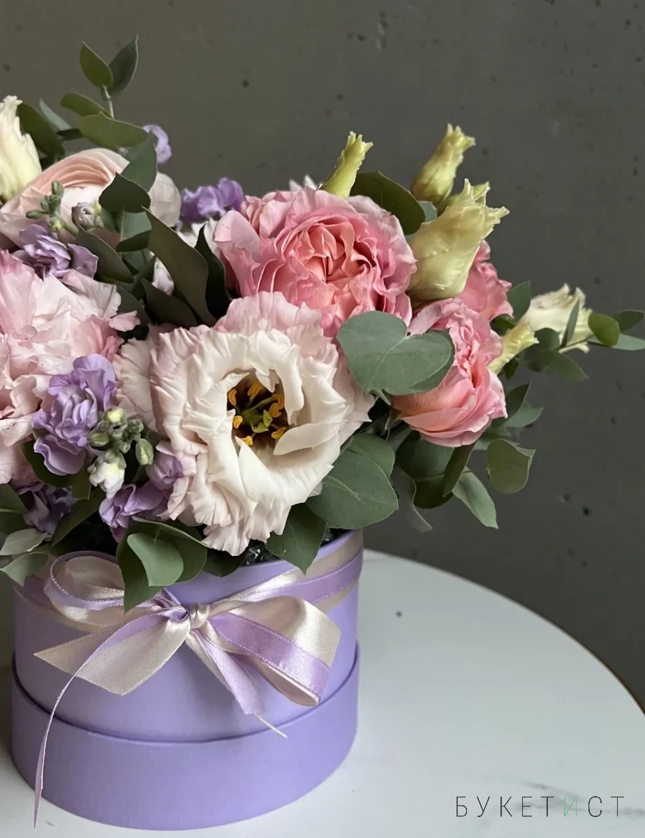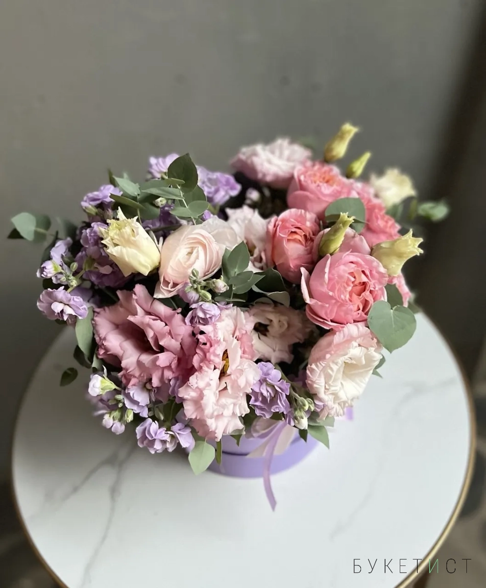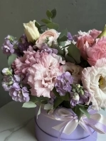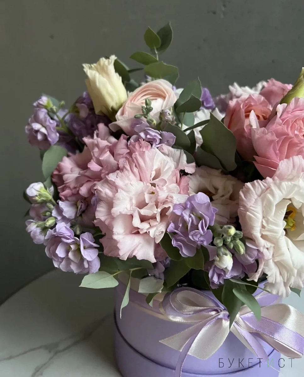 В составе: сезонные ранункулюсы сорта Ханой, персиковая пионовидная роза сорта Джульетта, кружевная эустома, ароматная маттиола, веточки эвкалипта и ароматные соцветия генисты.