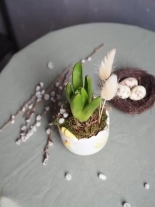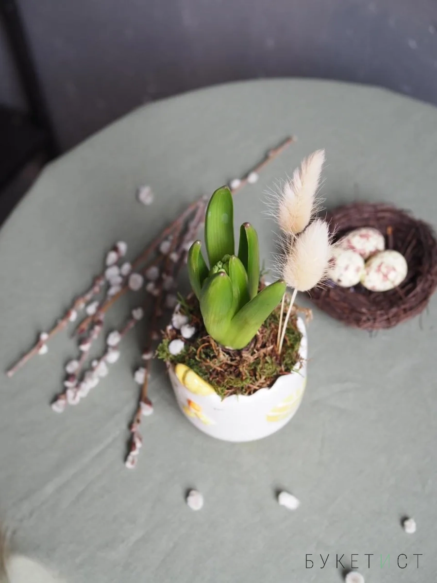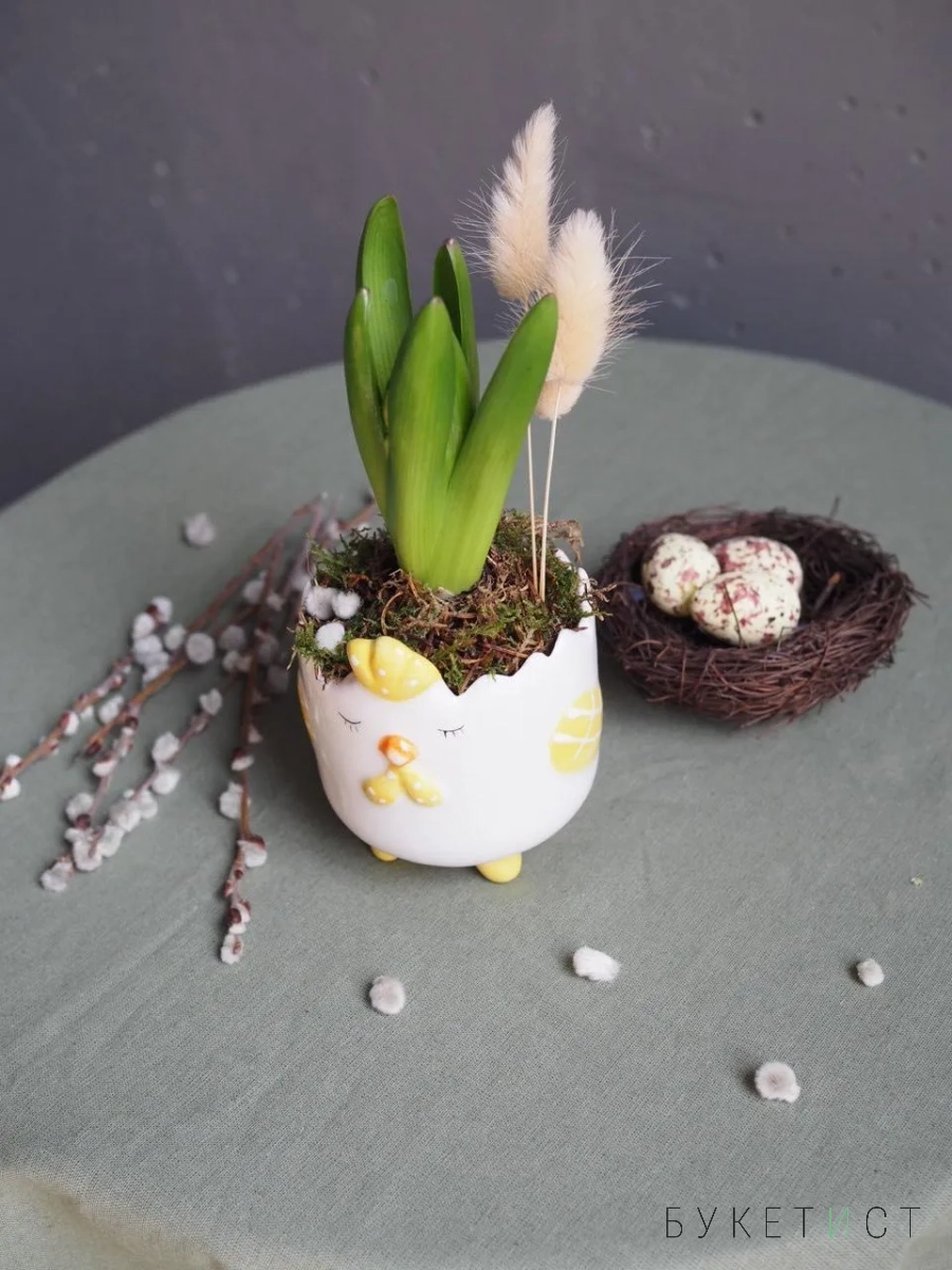 Композиция сочетает в себе луковицы солнечных нарциссов и декоративные элементы.