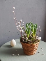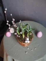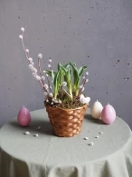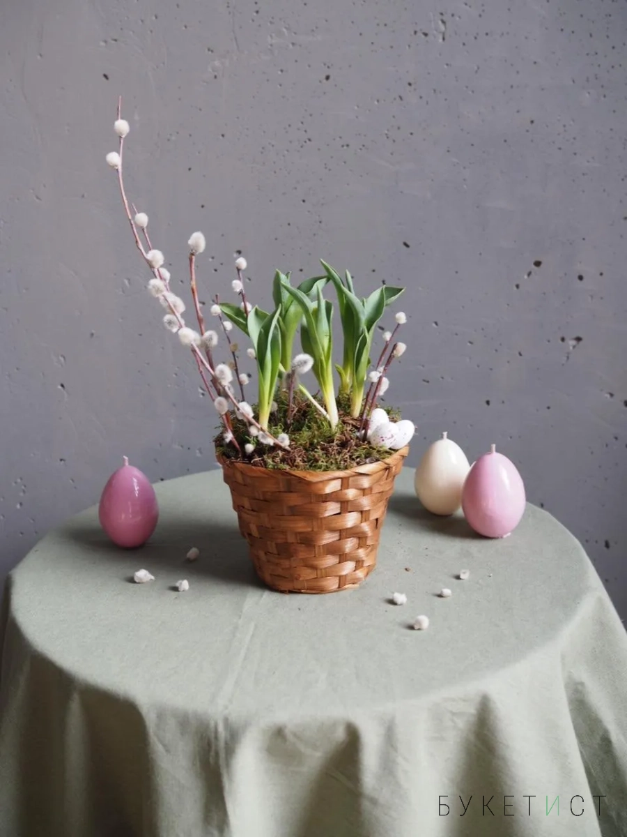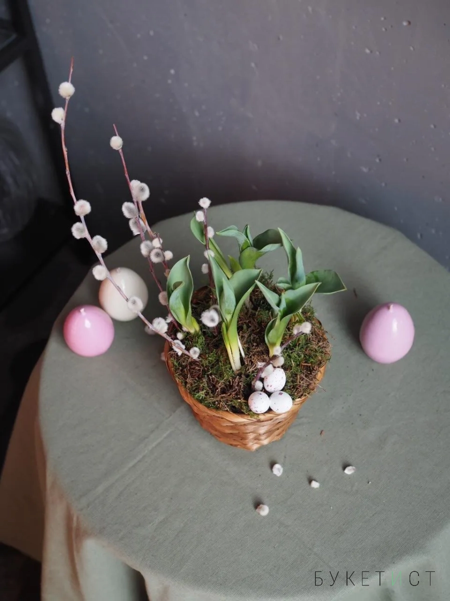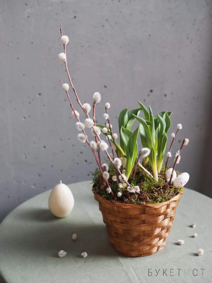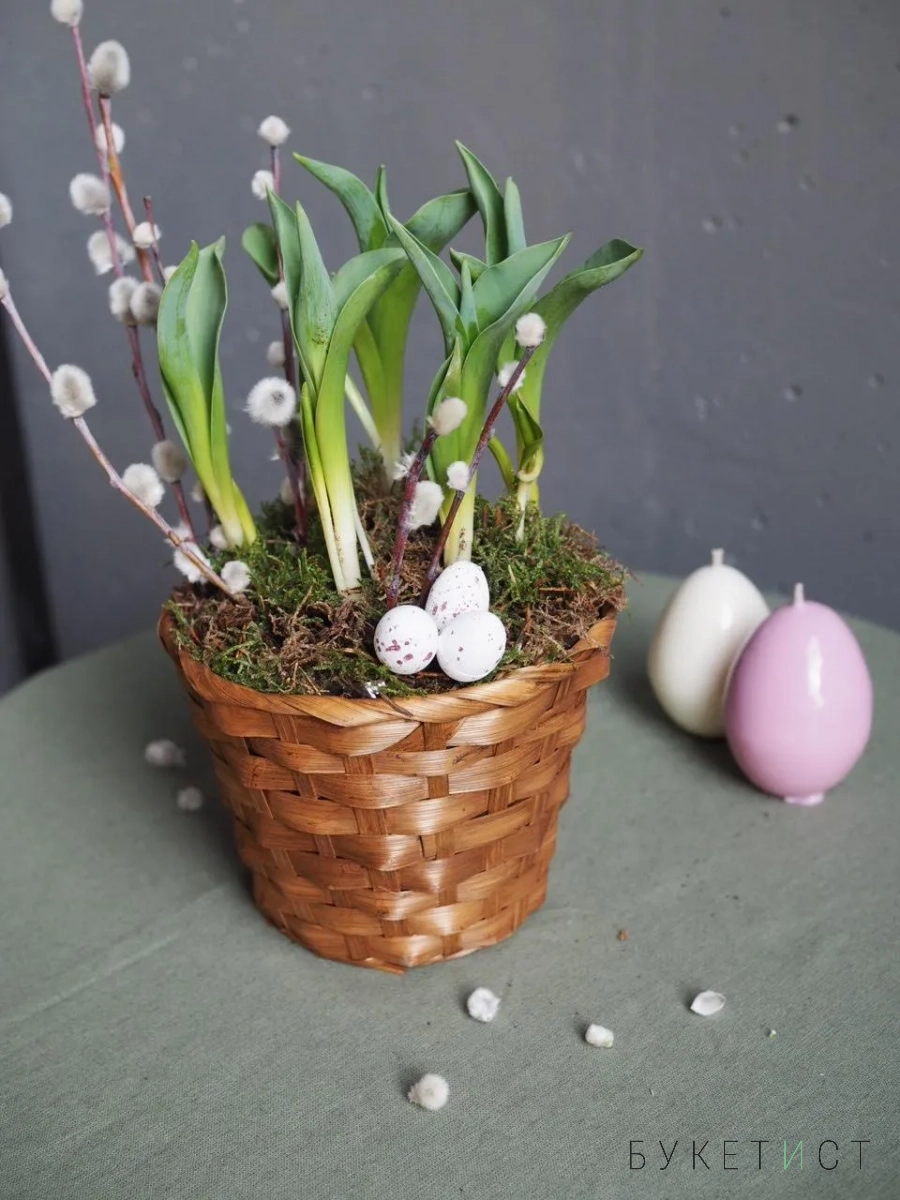 Композиция сочетает в себе луковицы тюльпанов, вербу и декоративные яйца-бусины.