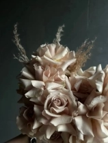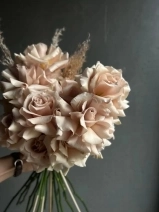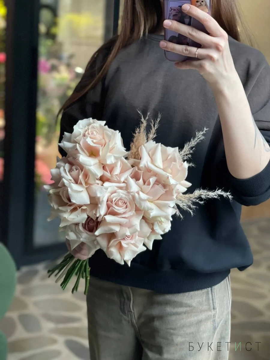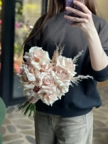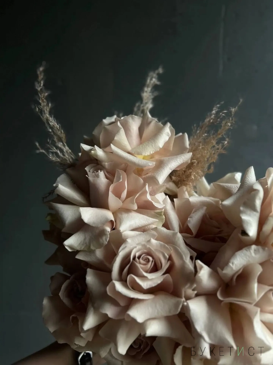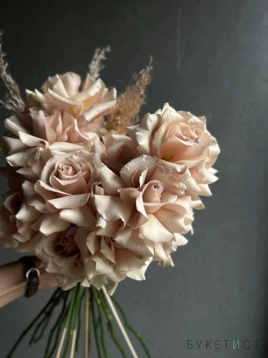 Свадебный букет интересной V-образной формы с ароматными цветами. Необычная форма букета сочетает в себе классические цветы - французские розы с эффектом кружева сорта Мента и пампасную траву.