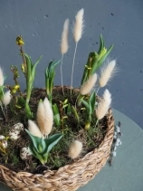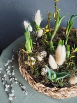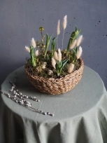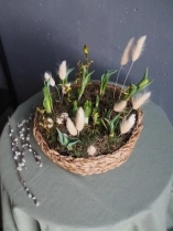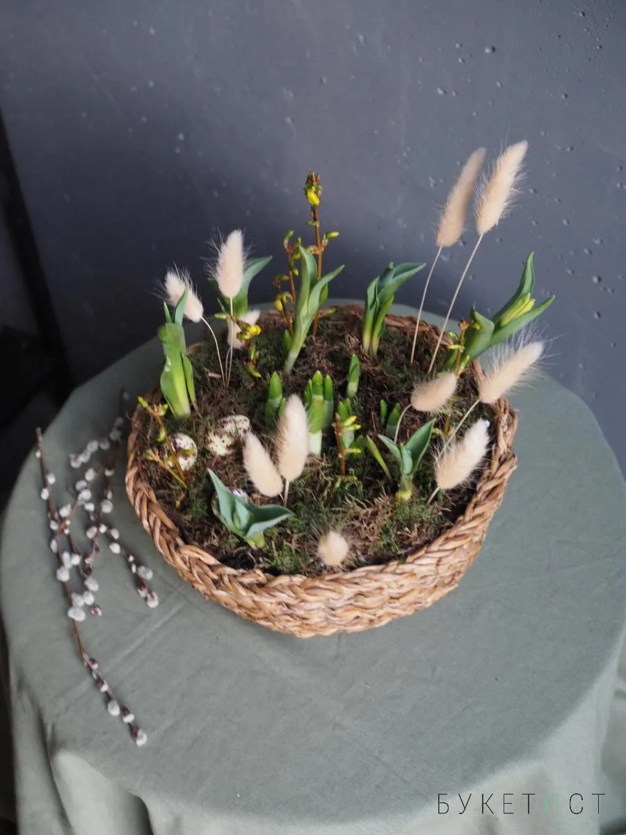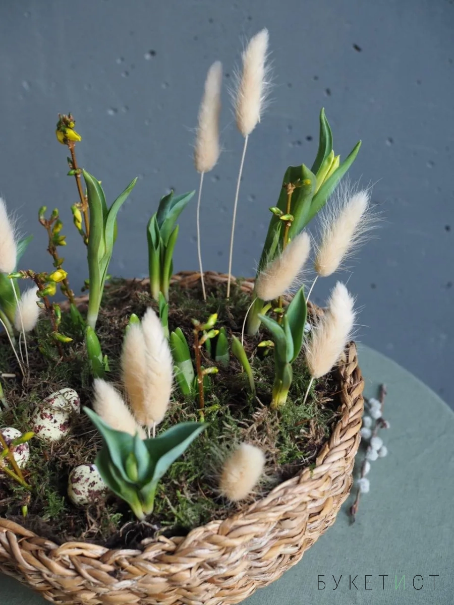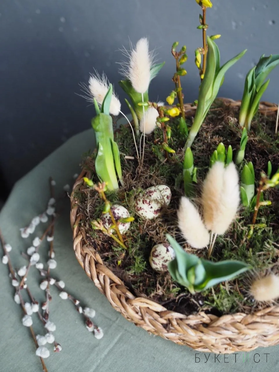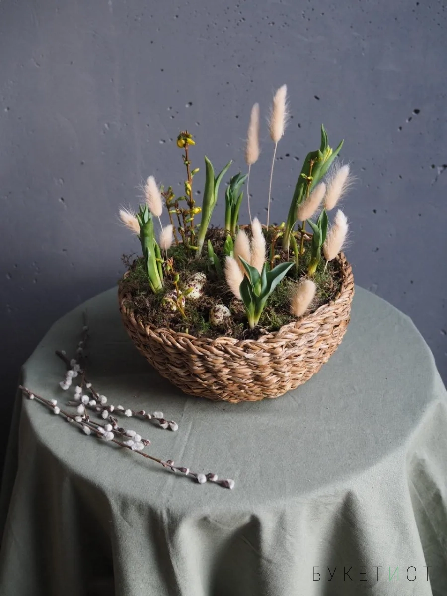 Плетёная корзина к Пасхе с форзицией и тюльпанами
