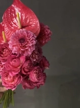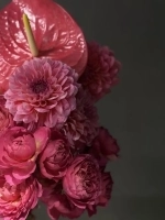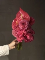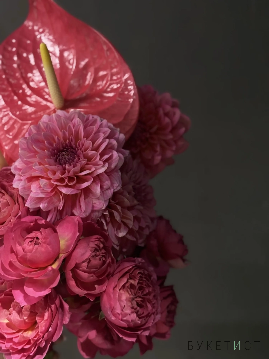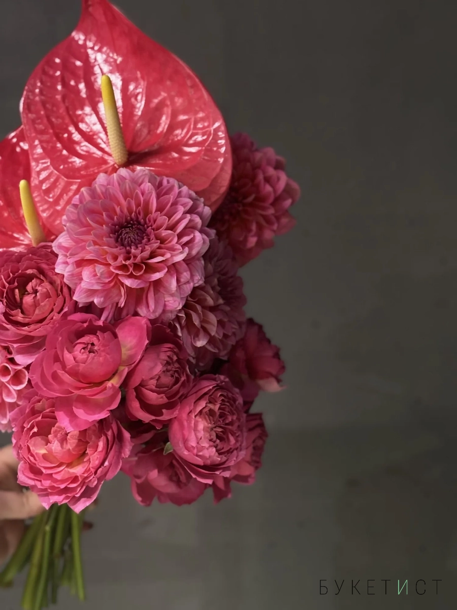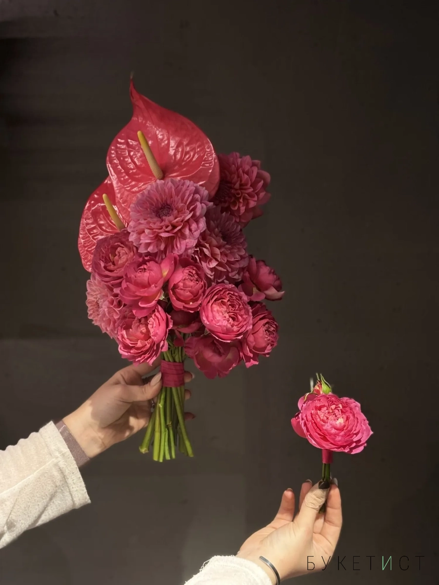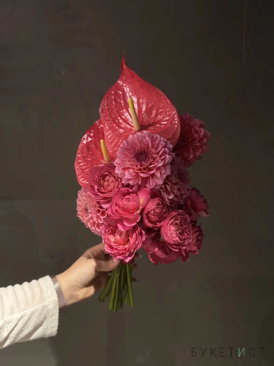 Свадебный букет интересной V-образной формы в яркой гамме. Необычная форма букета сочетает в себе необычные цветы - экзотичный антуриум, пионовидные розы Джульетта, махровый георгин.