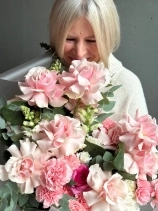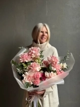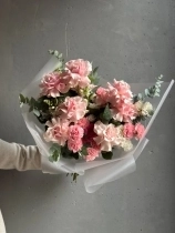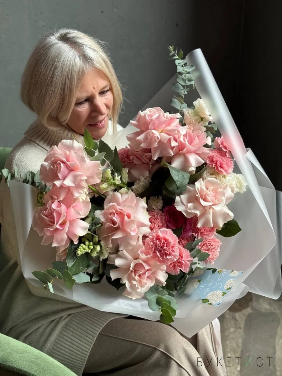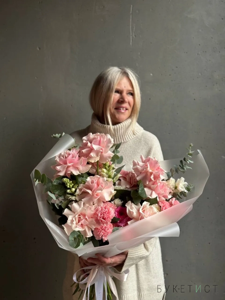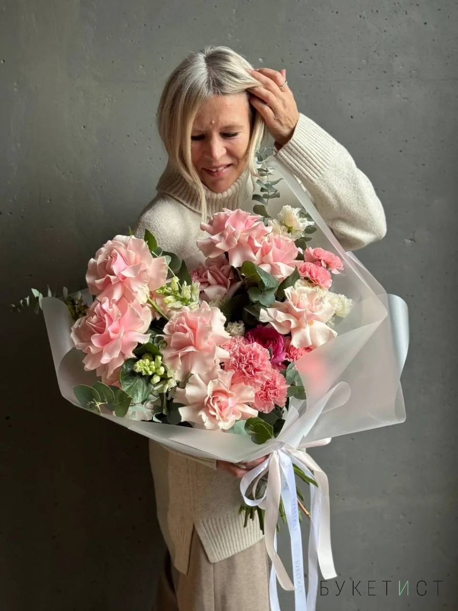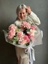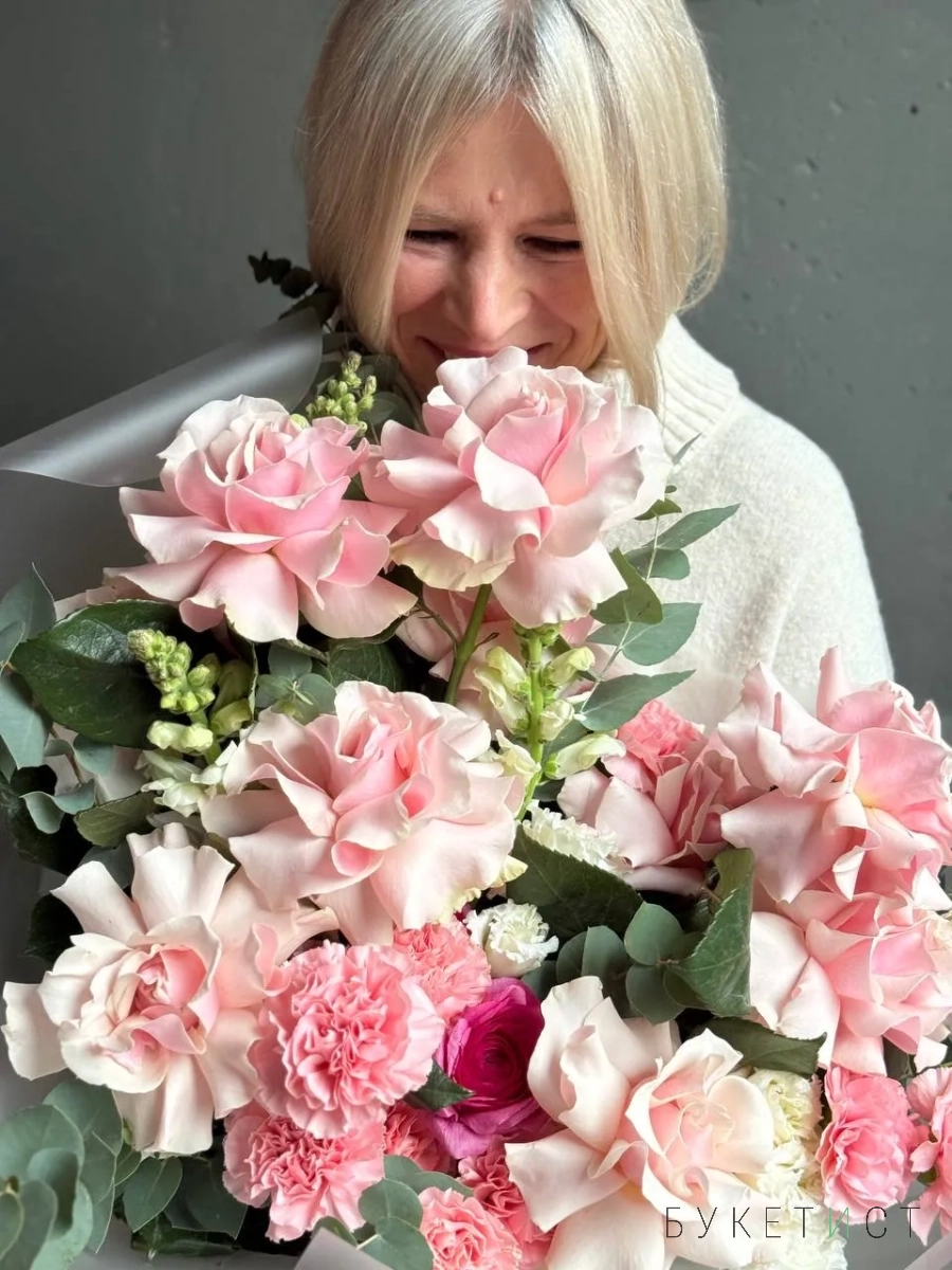 Авторский букет в нежной гаме. В состав входят ажурная роза сорта Пинк Мондиаль, стойкий диантус, кружевная эустома, фермерский леувенбек, сезонный ранункулюс и веточки эвкалипта. Прелесть, не правда ли?