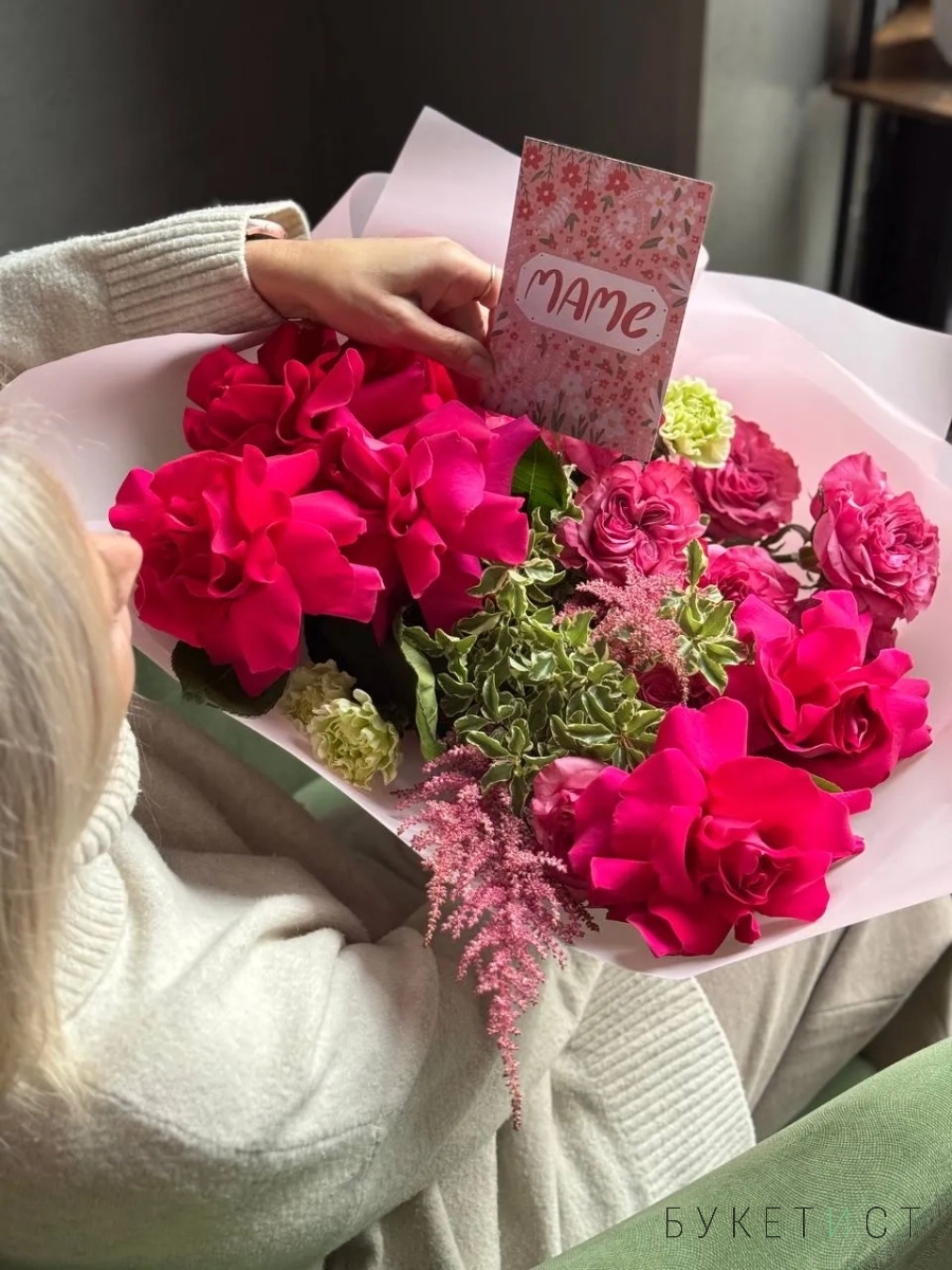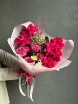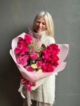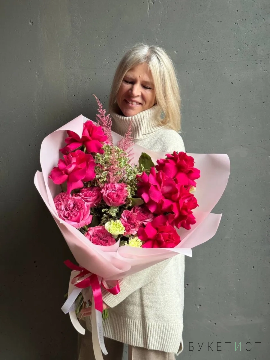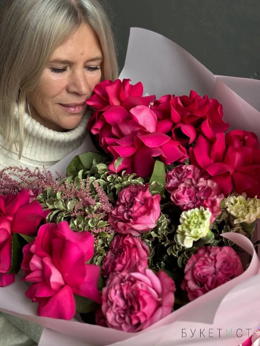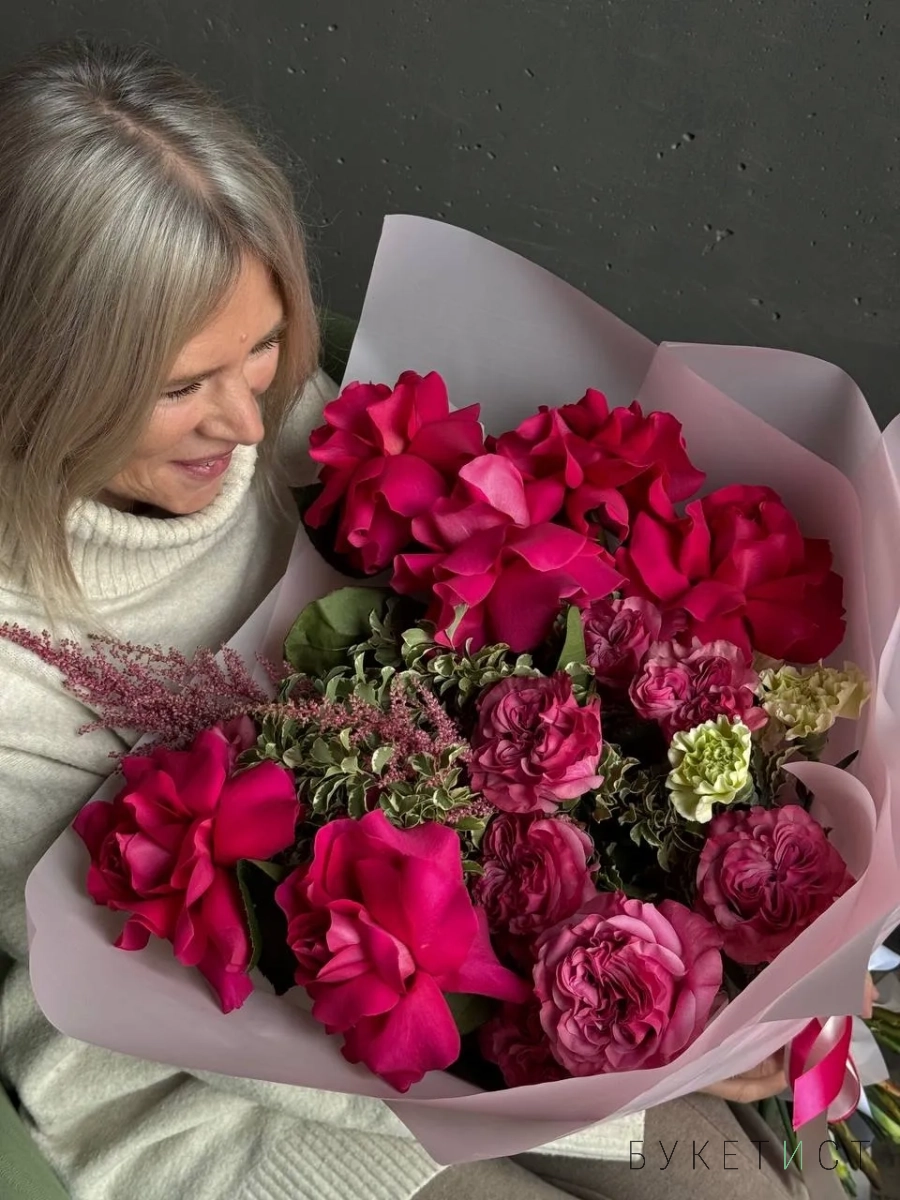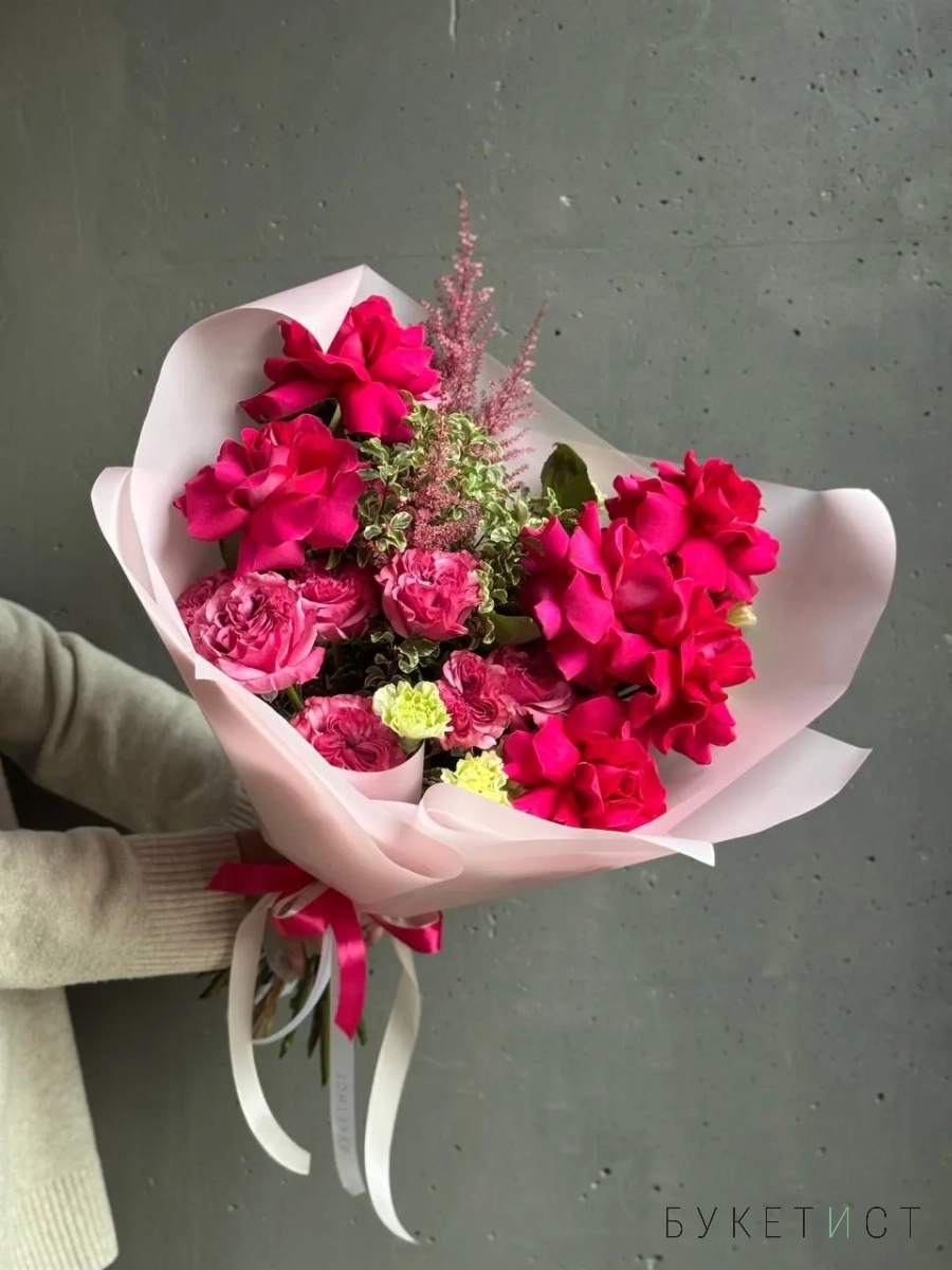 Авторский букет в ярко-розовой гамме. В составе представлены ажурная роза сорта Пинк Флойд, пионовидная роза сорта Кантри Блюз, стойкий диантус, пушистая астильба и веточки питтоспорума. Прелесть, не правда ли?