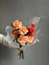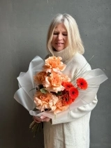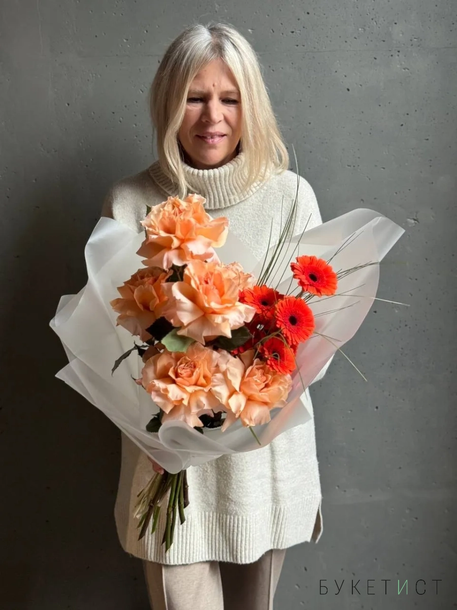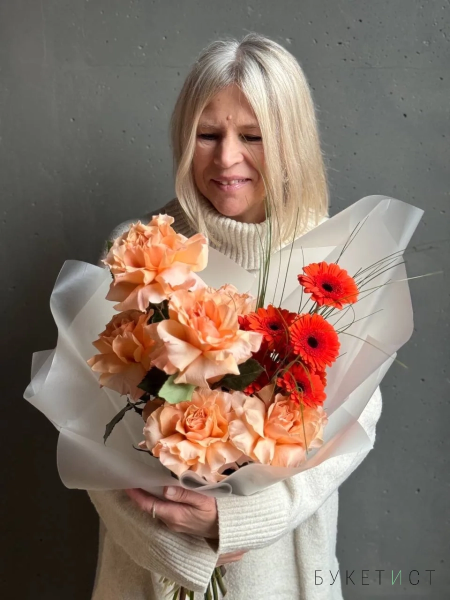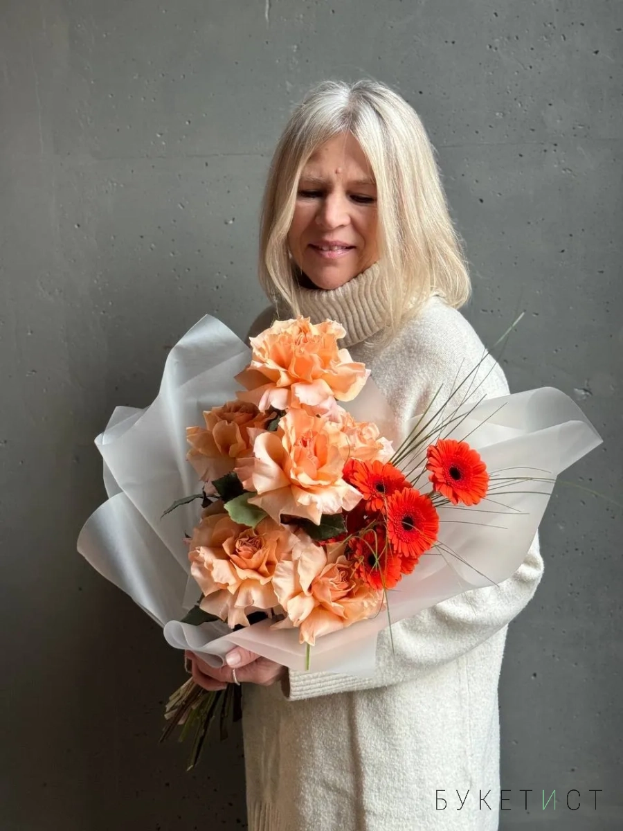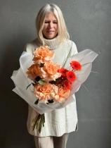Авторский букет в персиковой гамме. В состав входят ажурные розы сорта Шиммер, яркие герберы и акценты в виде веточек берграсса. Прелесть, не правда ли?