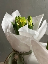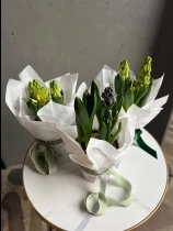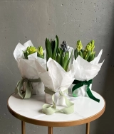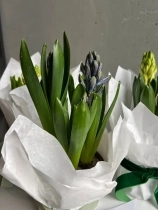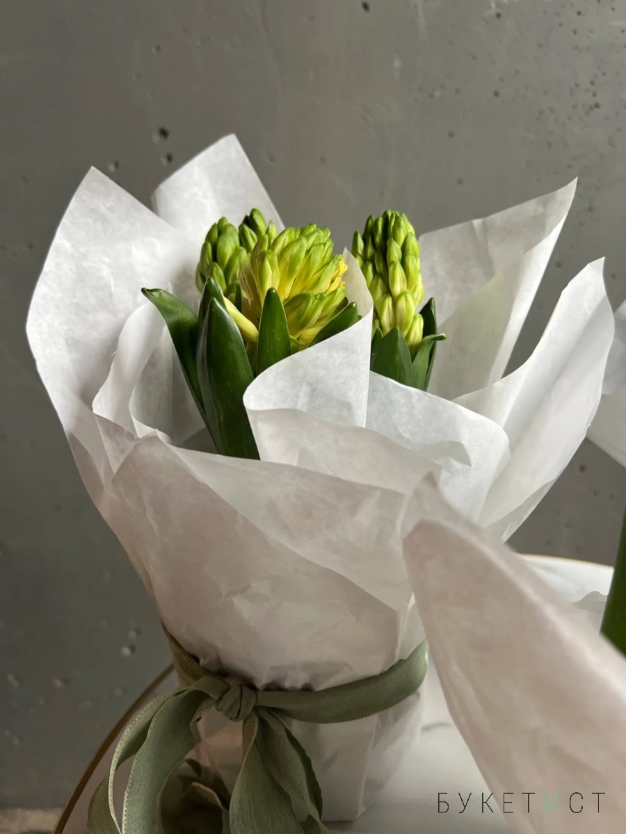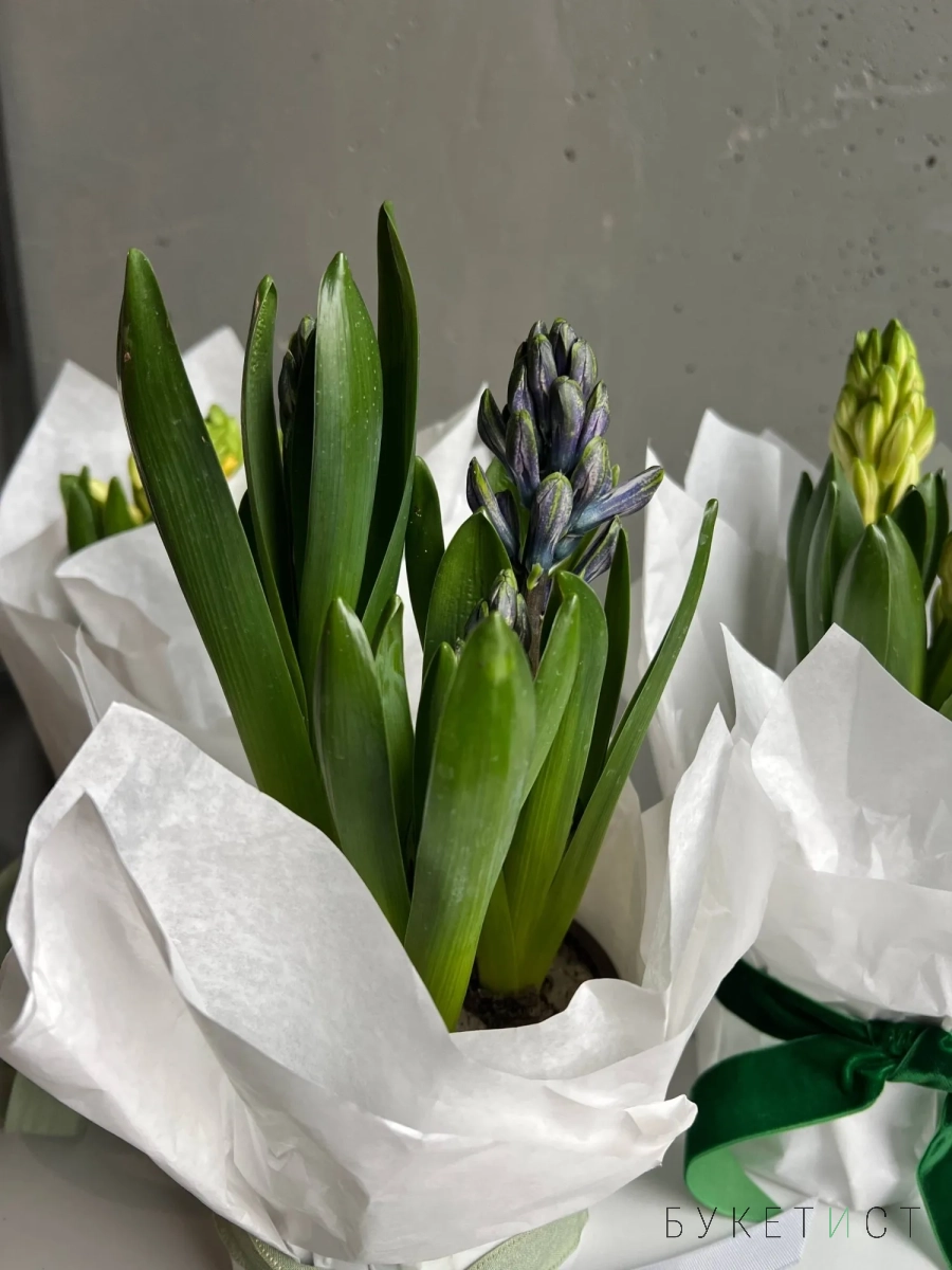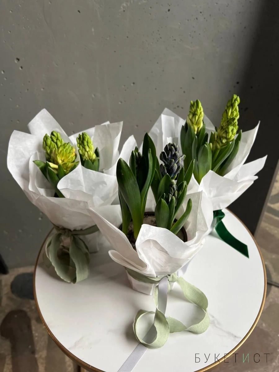 Нежная и стильная композиция из трех луковиц гиацинтов, аккуратно обёрнутая в тишью, — это живой акцент, который радует не один день, а целую историю цветения.
