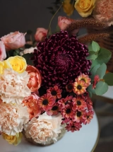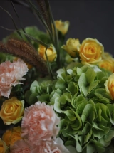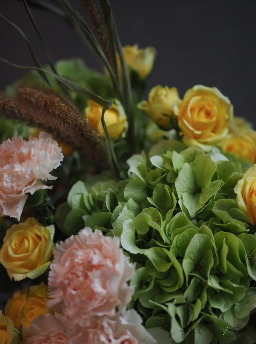 В составе: пионовидные розы сорта Джульетта, желтые кустовые розы, гвоздики, одноголовые хризантемы сорта Бигуди, кустовая хризантема, гортензия, фермерская сетария и веточки эвкалипта.