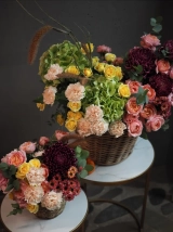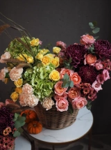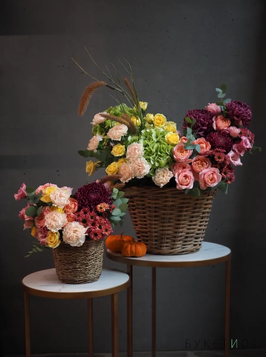 Сэт композиций в осенней гамме в плетеных корзинах с розами и гортензиями