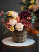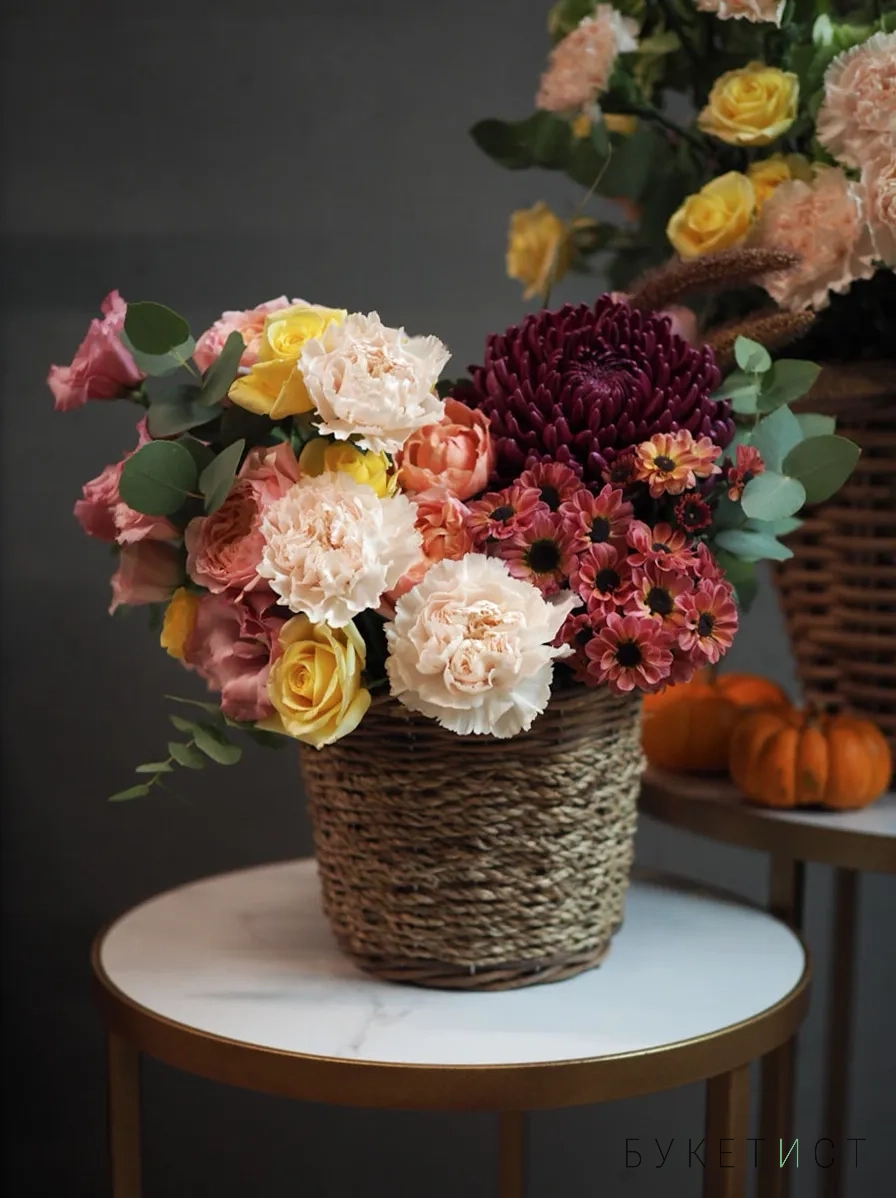 Большая композиция в плетенной корзине. Цветы установлены в оазис (флористическая губка), требуют умеренного полива раз в два дня.