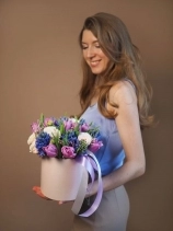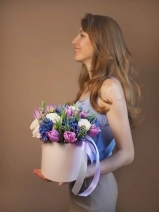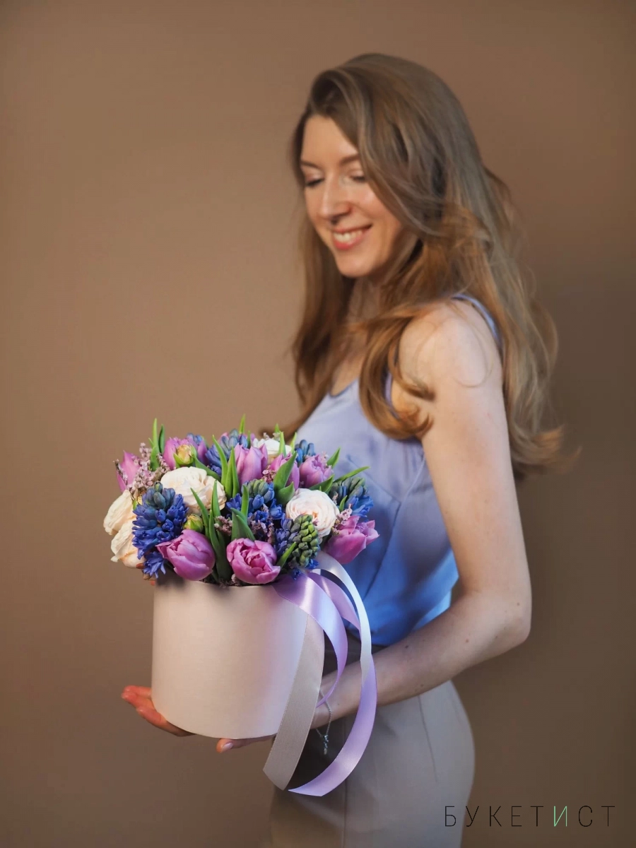 Весенний букет в шляпной коробке с гиацинтами и тюльпанами