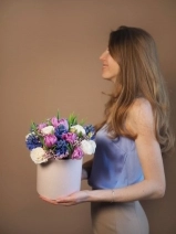 Как мы оформляем: цветы установлены в флористическую губку (оазис), которая обеспечивает им свежесть и форму. Уход за композицией прост: достаточно поливать губку небольшим количеством воды раз в два дня.
