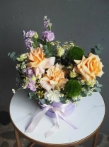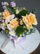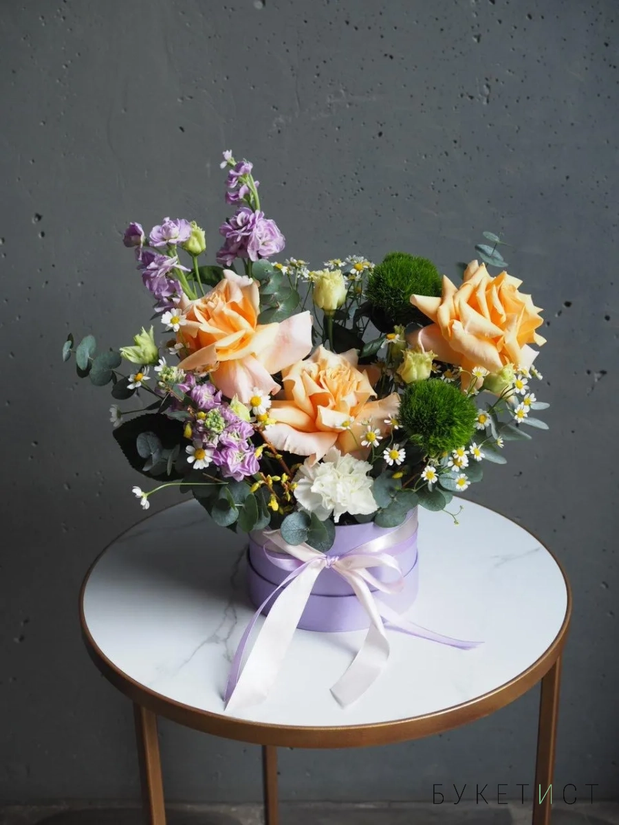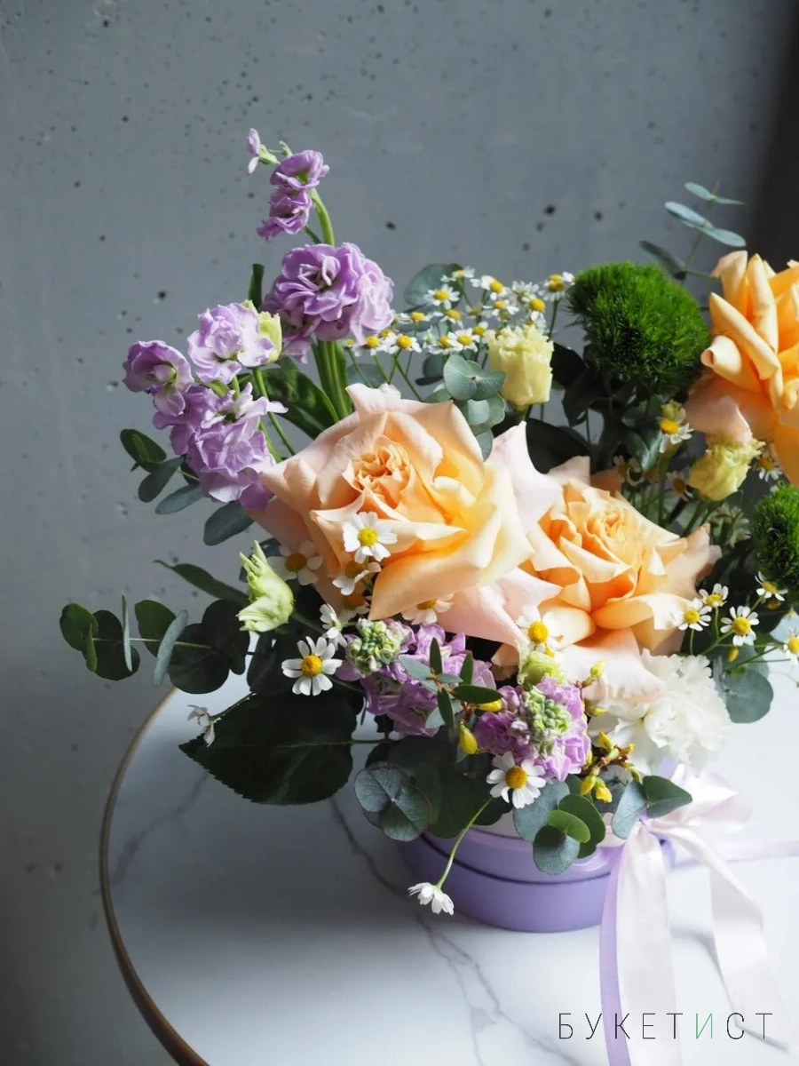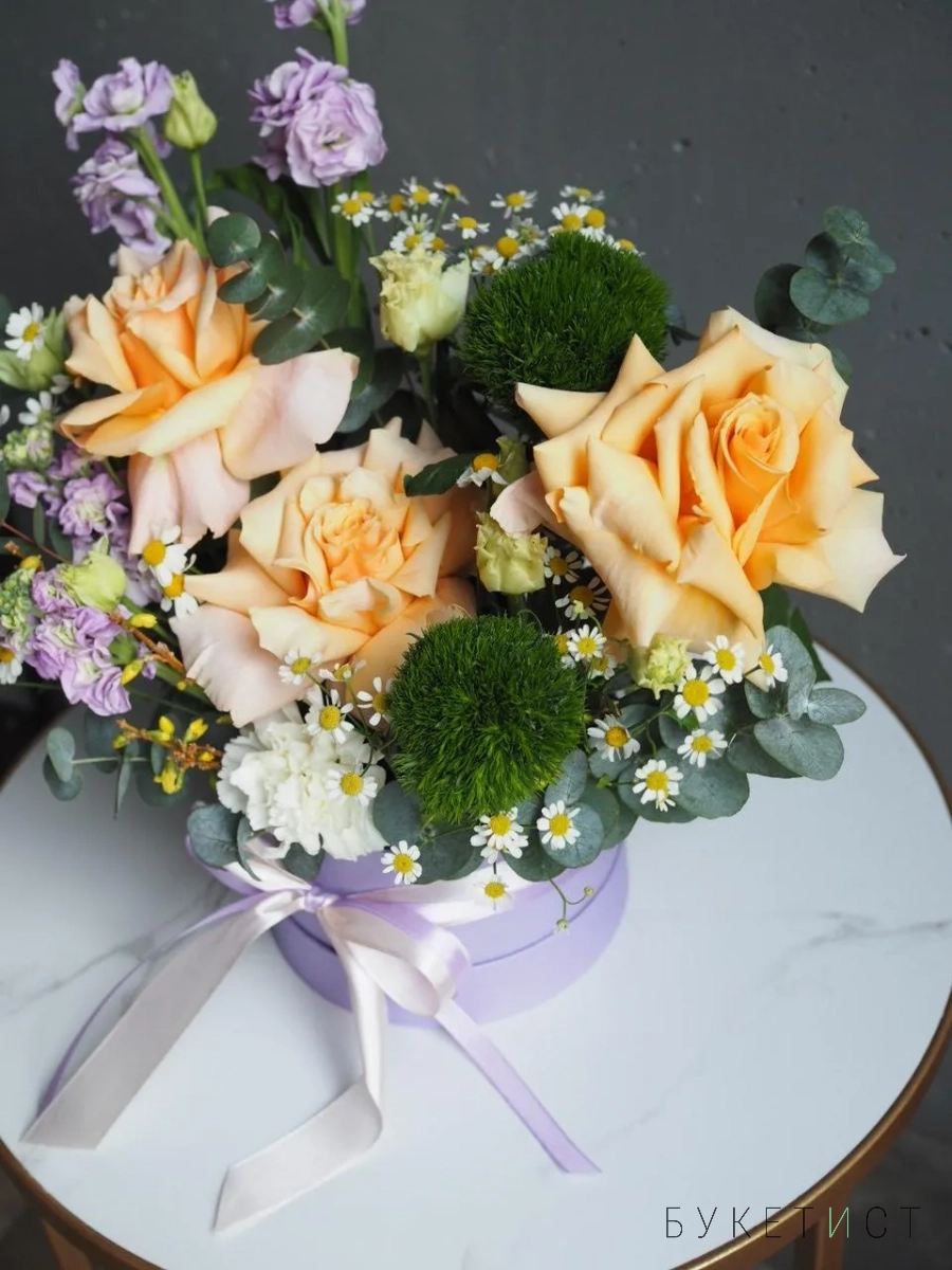 В составе: ажурные розы сорты Shimmer, ароматная маттиола, веточки эвкалипта, ромашки, стойкие диантусы и эустома.