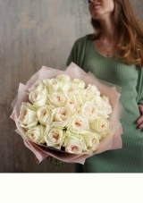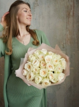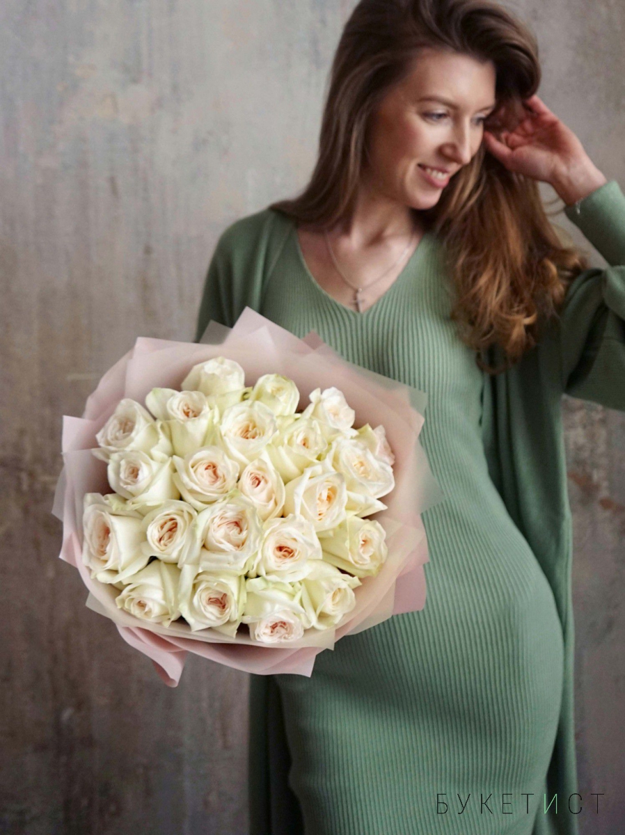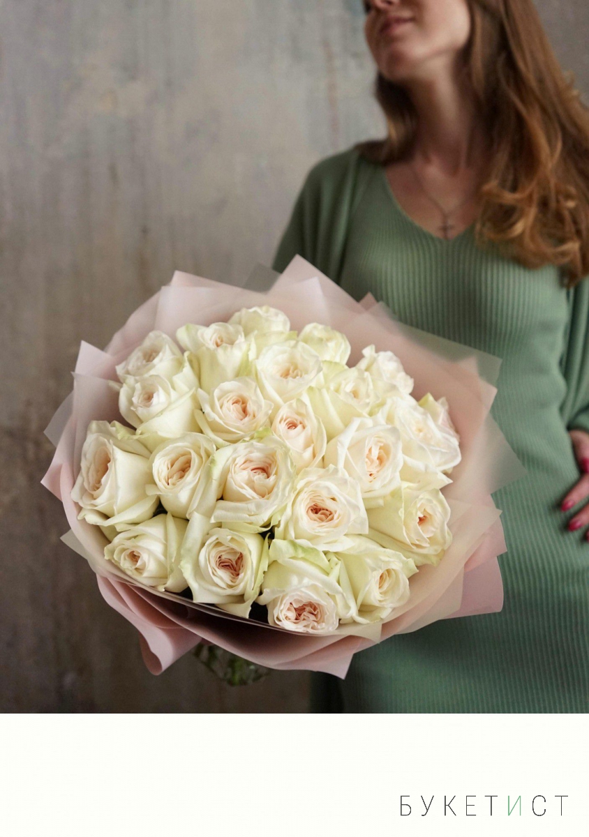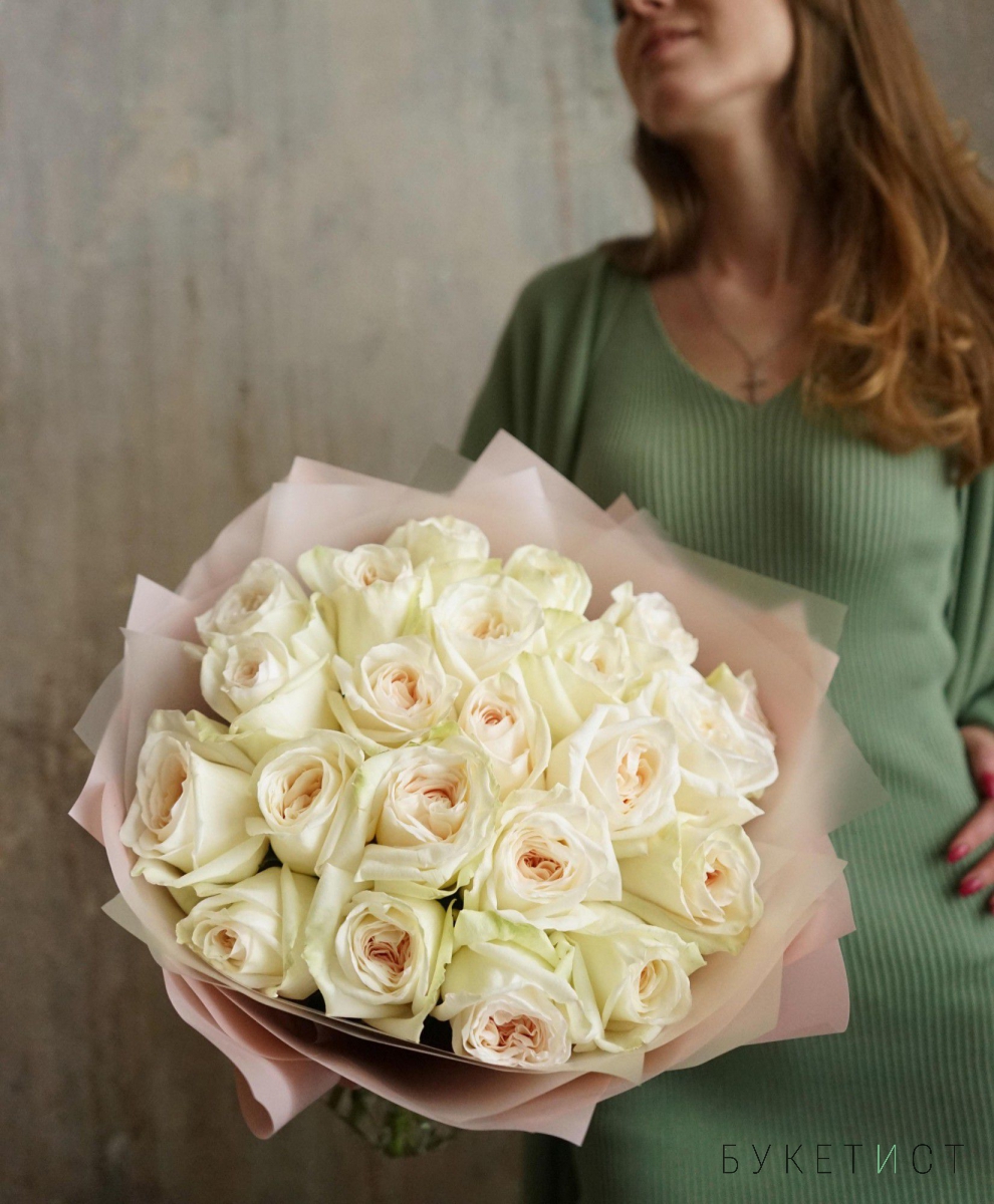 Монобукет из пионовидных роз премиум-сорта Вайт Охара. На фото представлен букет из 19 стеблей.
