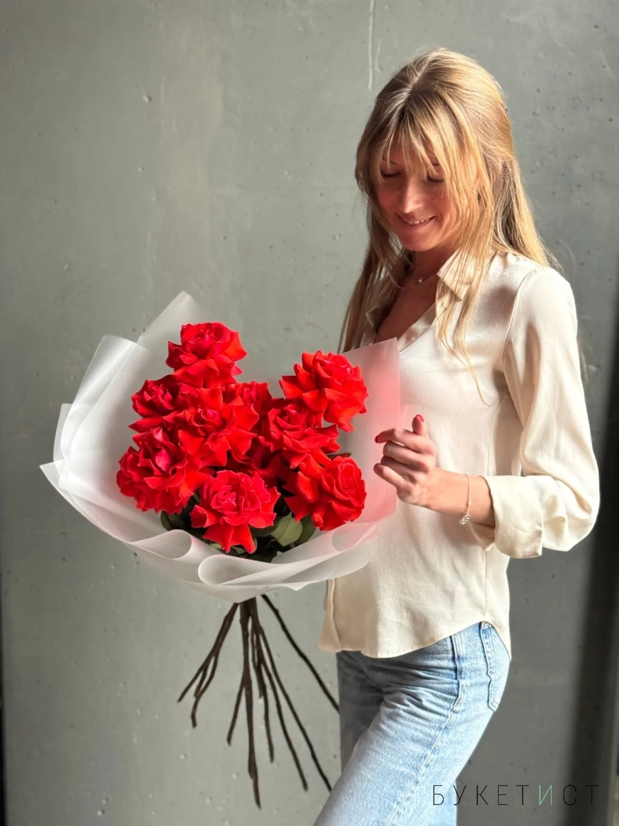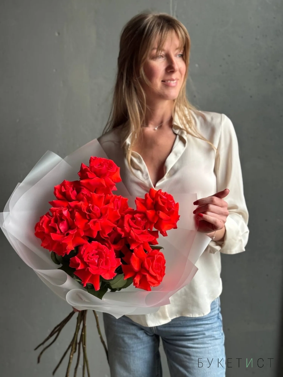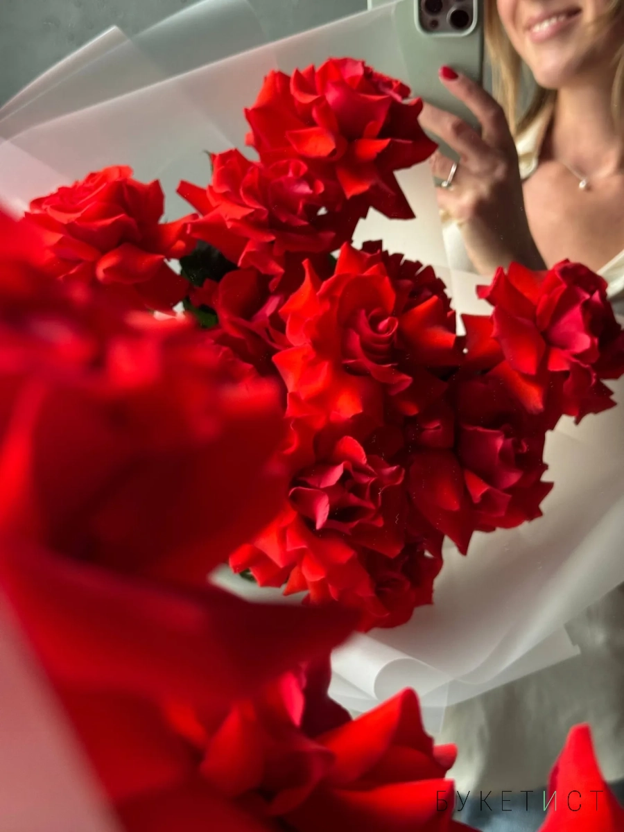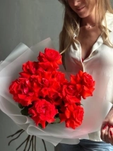 Монобукет из алых роз премиум-сорта Nina. Букет собран в разновысотной технике, а каждый лепесток розы вывернут вручную - так создается объем и особый эффект "кружева". На фото представлен букет из 11 стеблей. Прелесть, не правда ли?