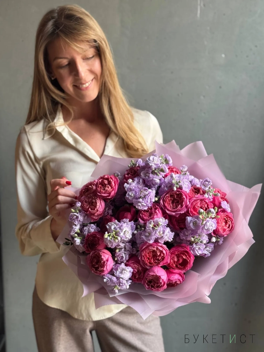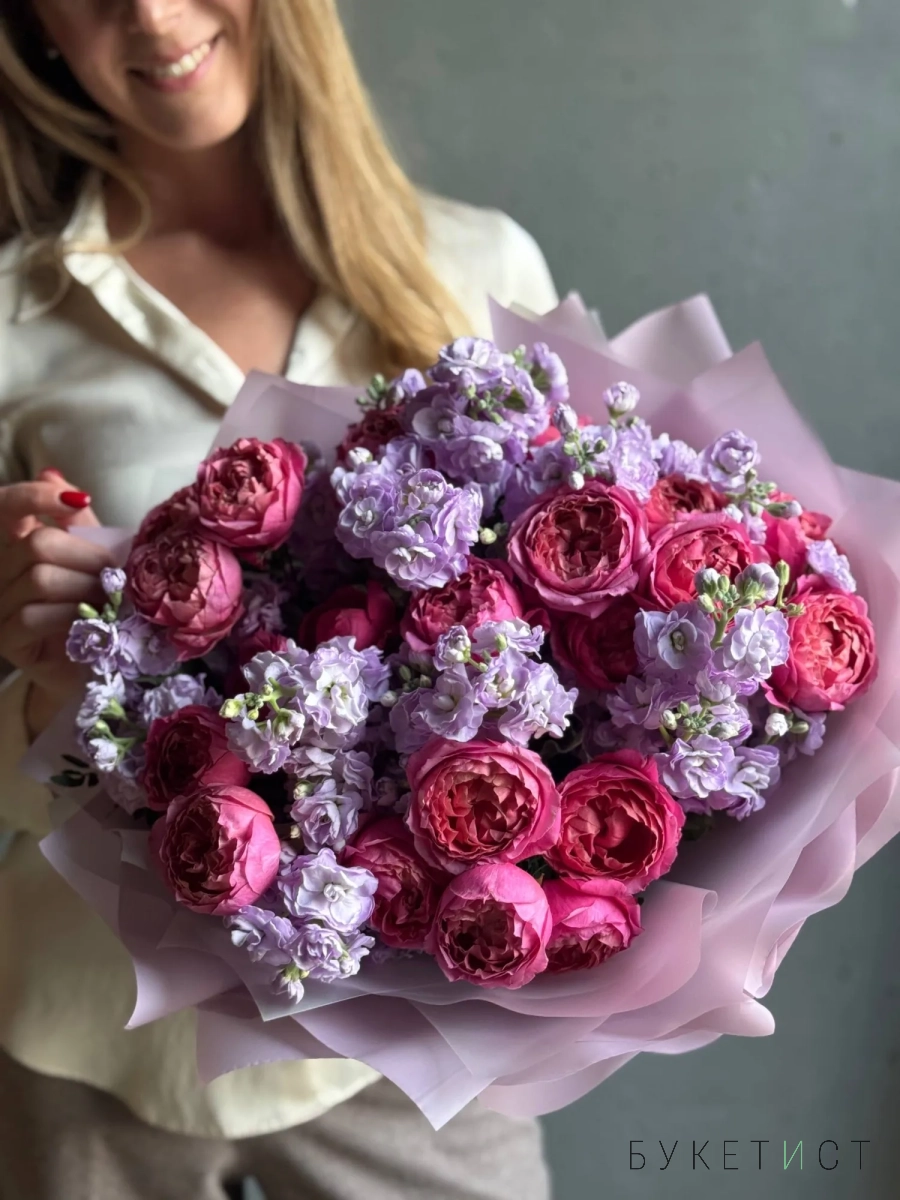 Дуо-букет из кустовой ароматной маттиолы и кустовой розы. На фото представлен букет из 19 стеблей.