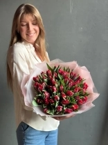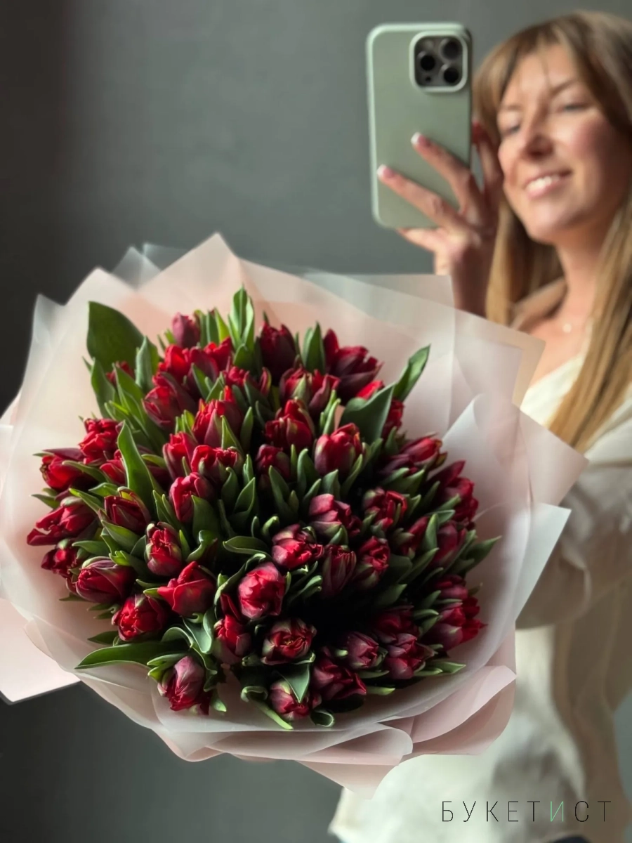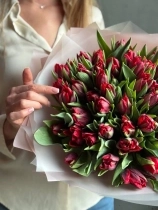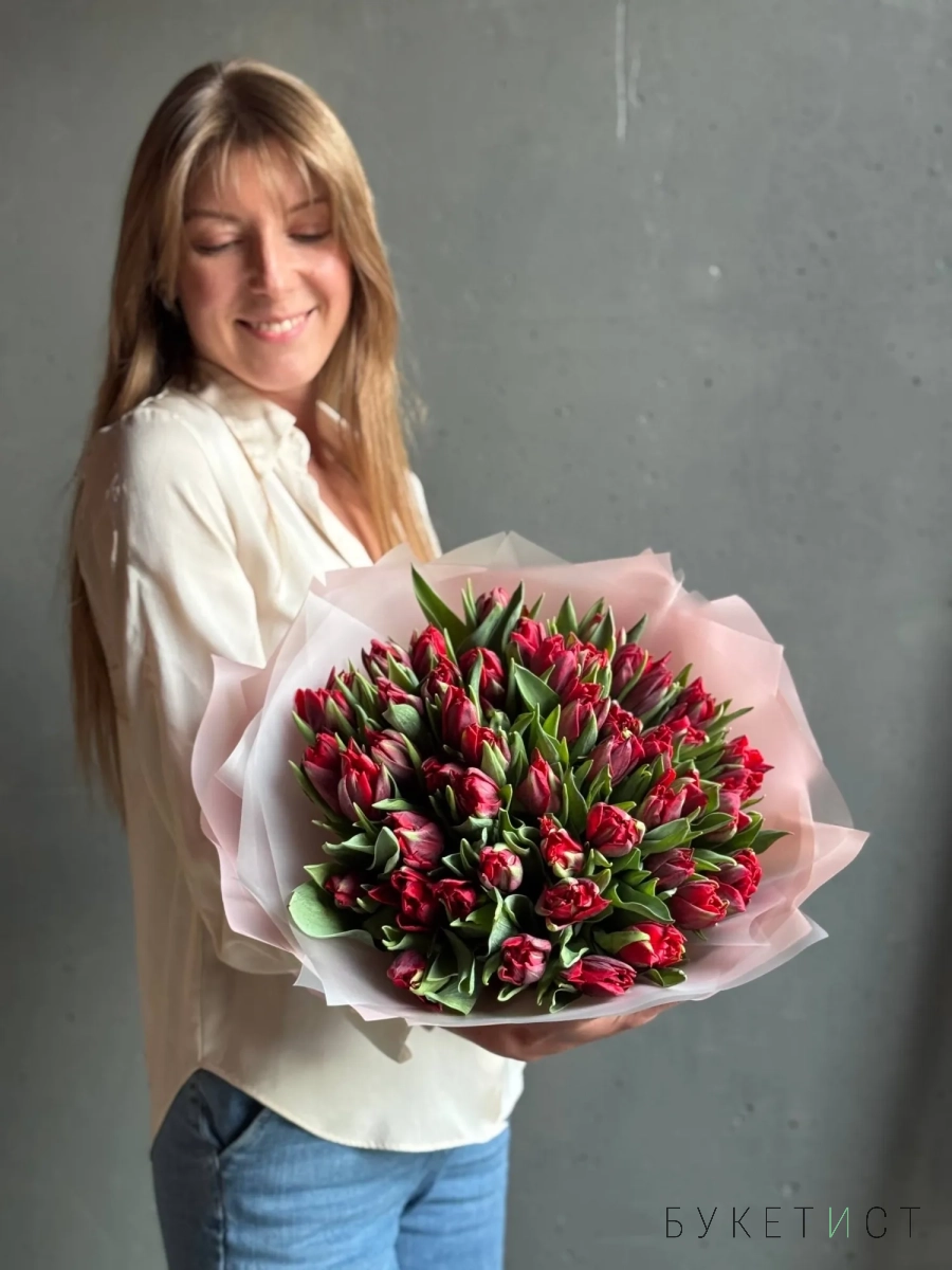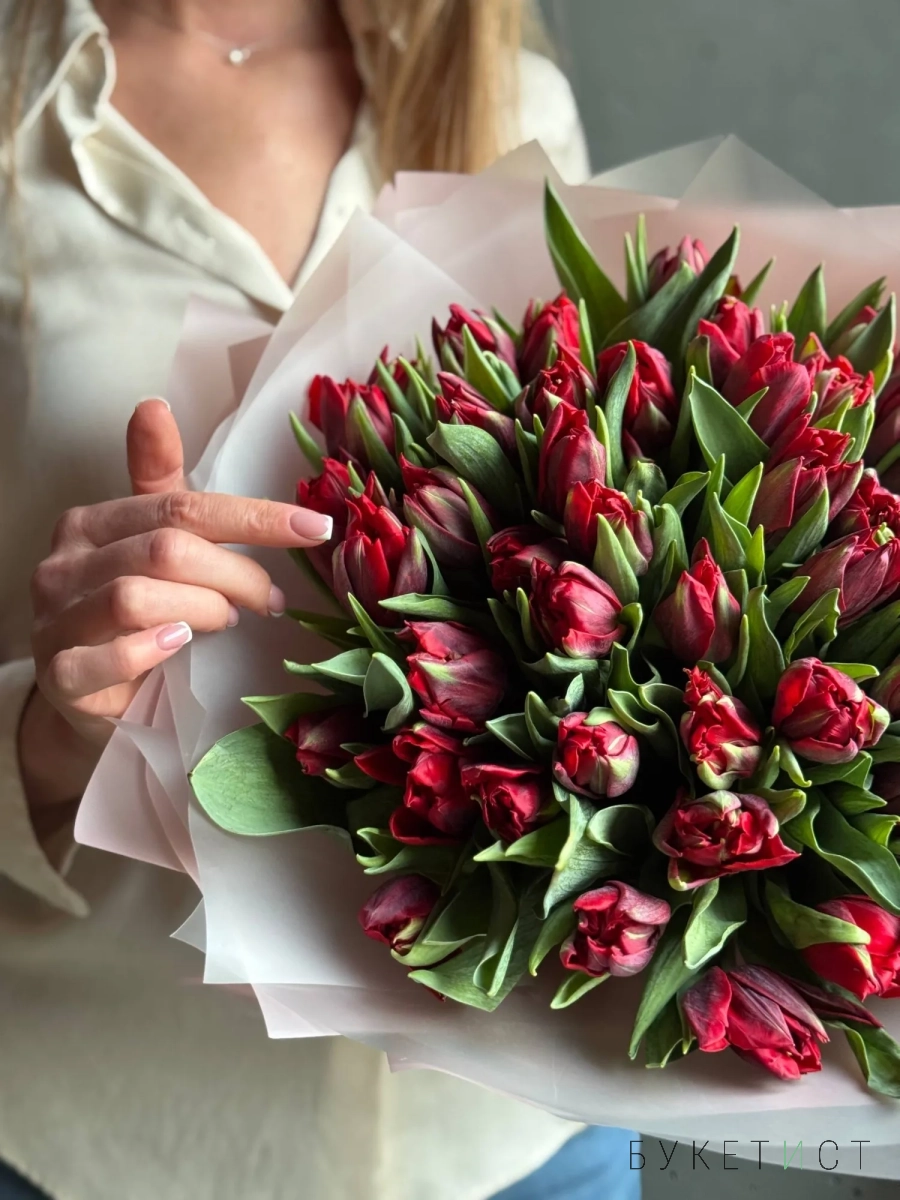 Монобукет из красных пионовидных тюльпанов сорта Ред Принцесс.