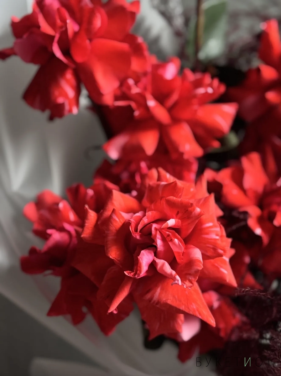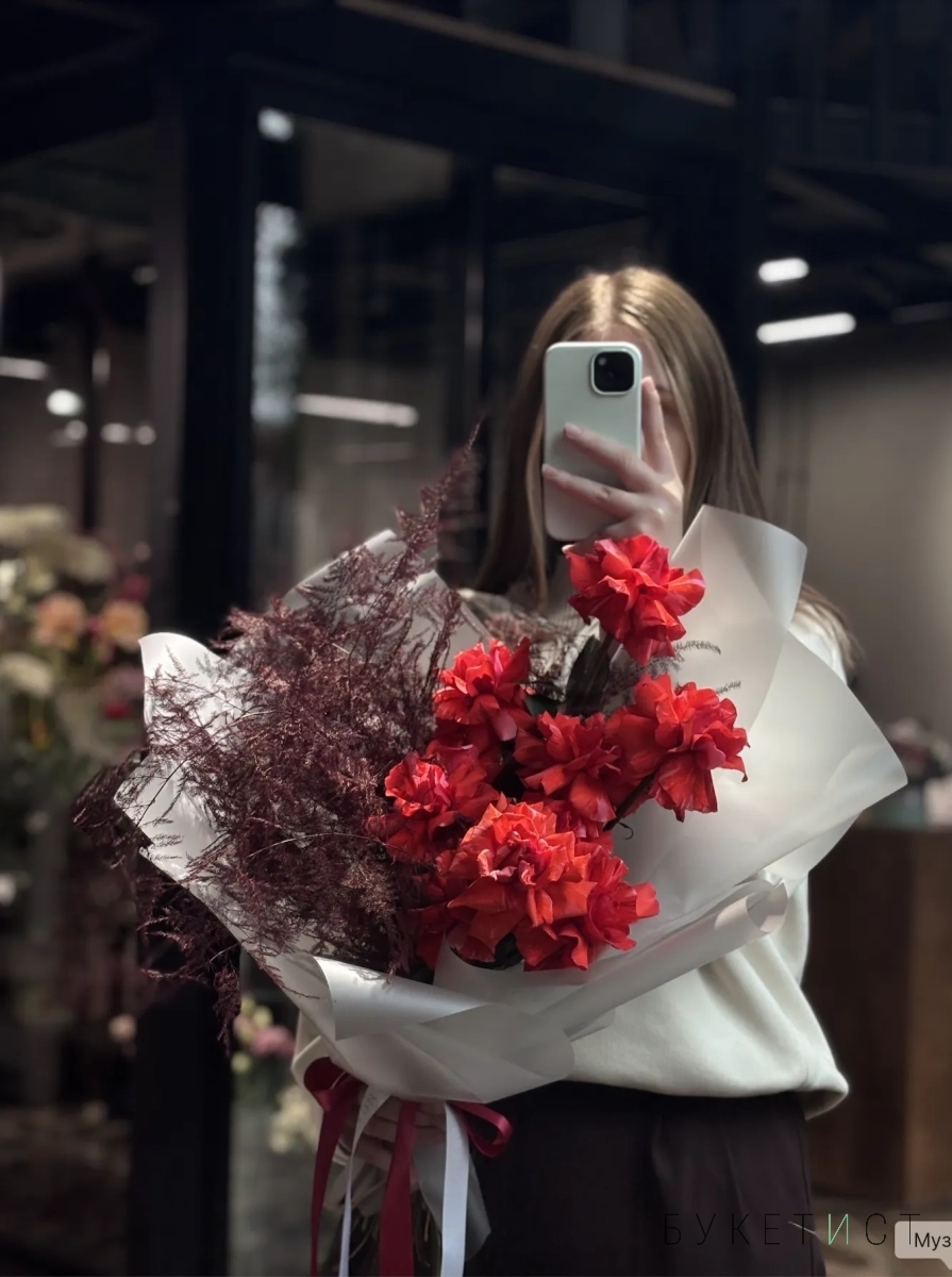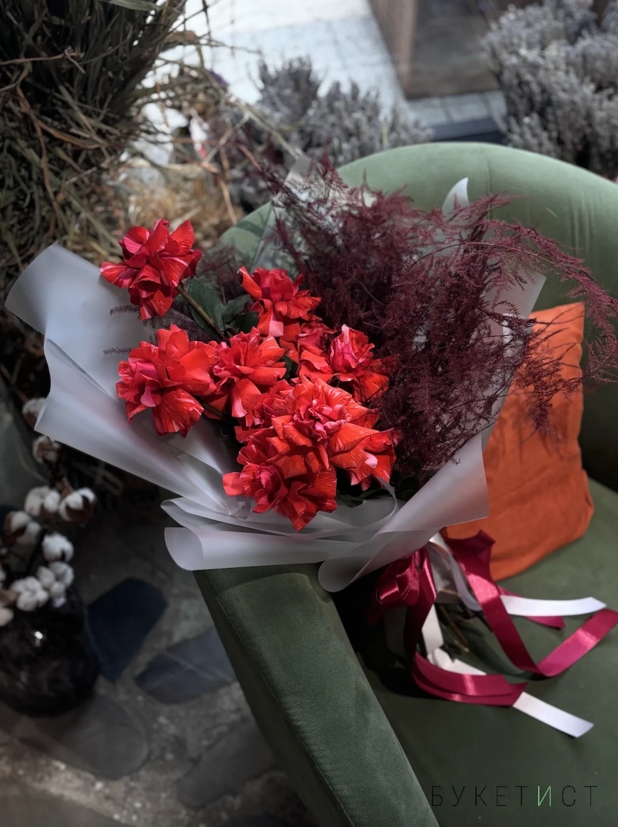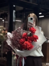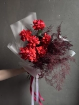 Монобукет из ажурныйх алых роз сорта Нина и пушистого аспарагуса. Букет собран в разновысотной технике, а каждый лепесток розы вывернут вручную - так создается объем и особый эффект "кружева". Прелесть, не правда ли?