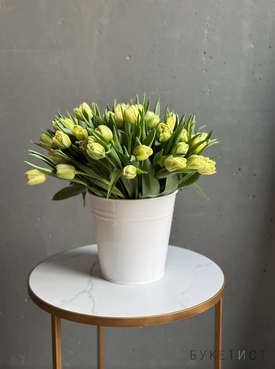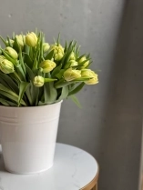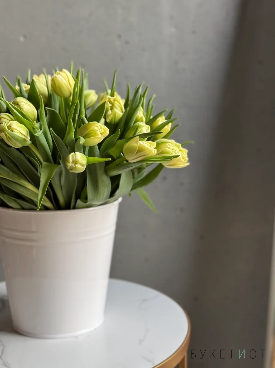 Охапка лимонных тюльпанов в ведре