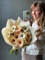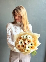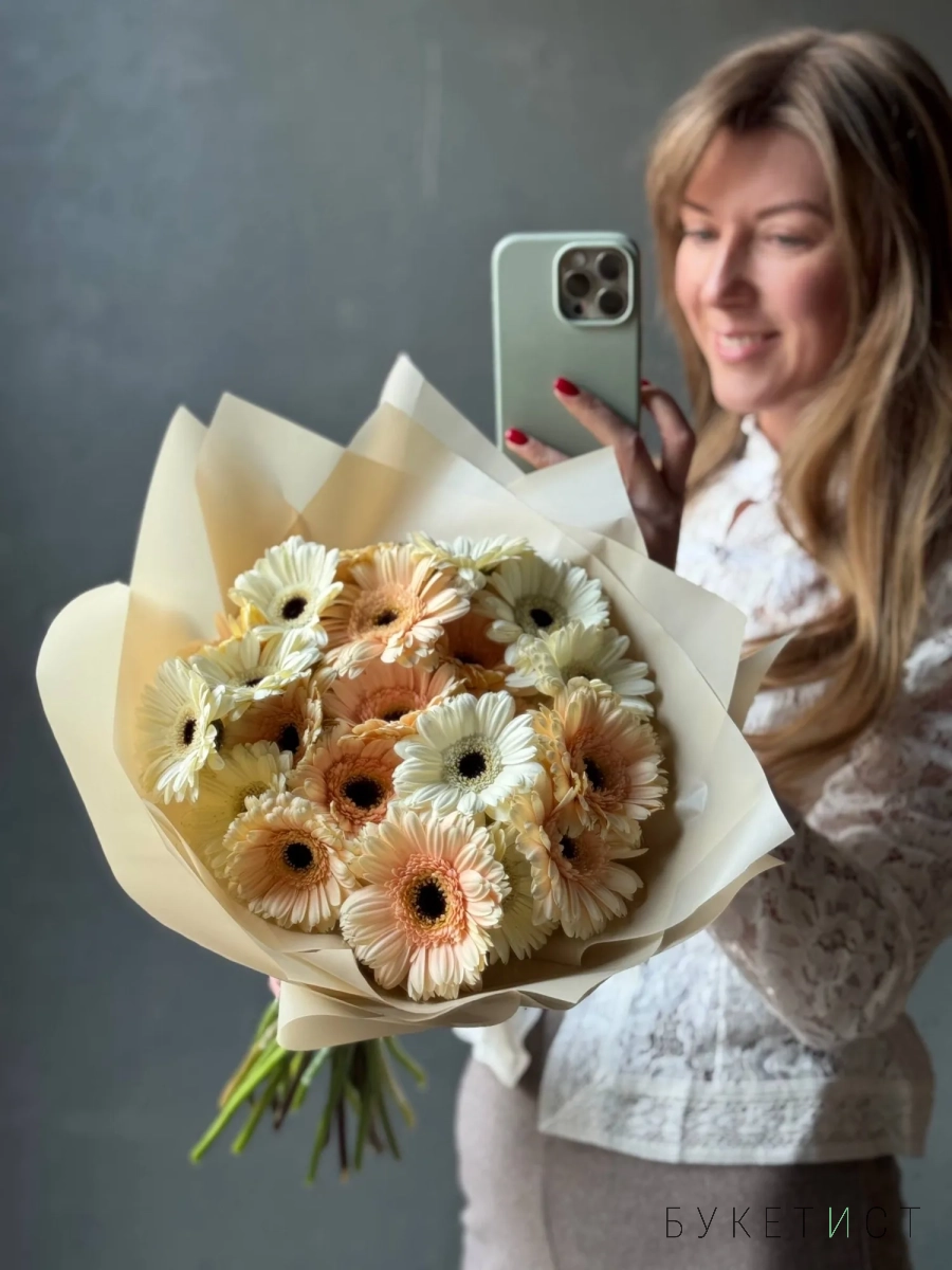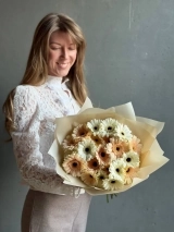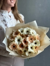 Яркий букет нежных белых и персиковых гербер, 25 стеблей