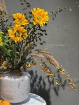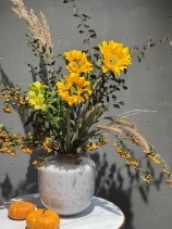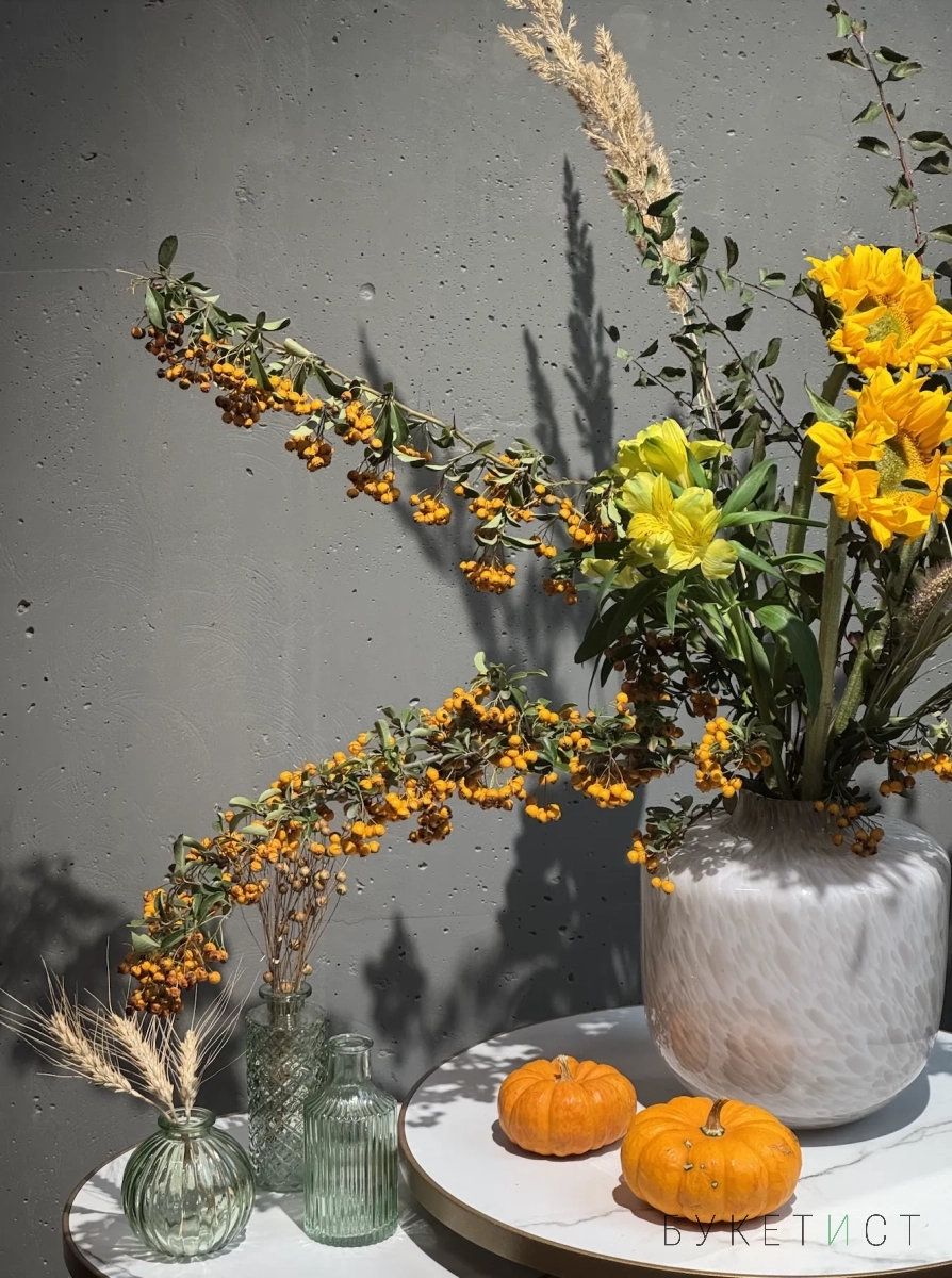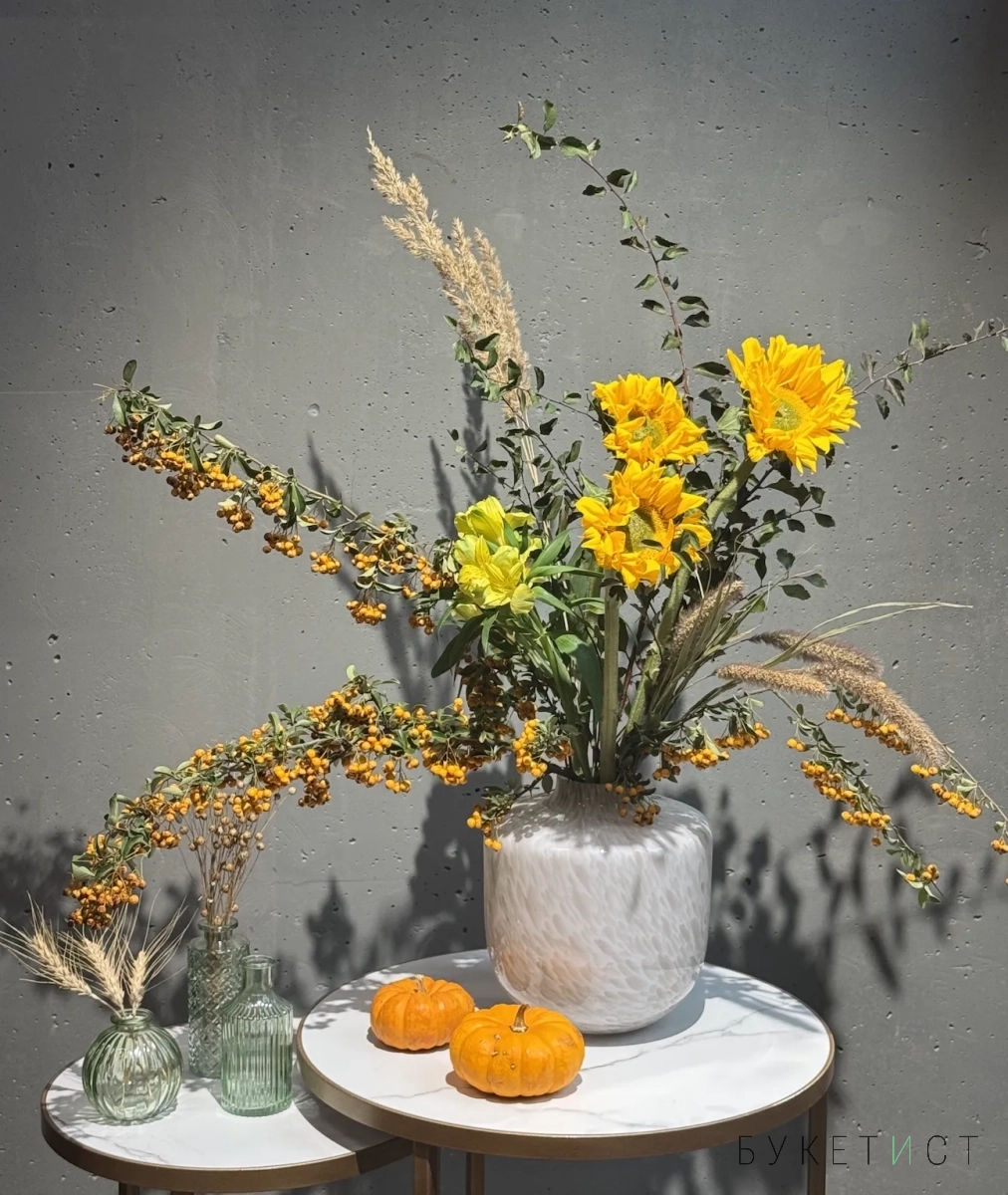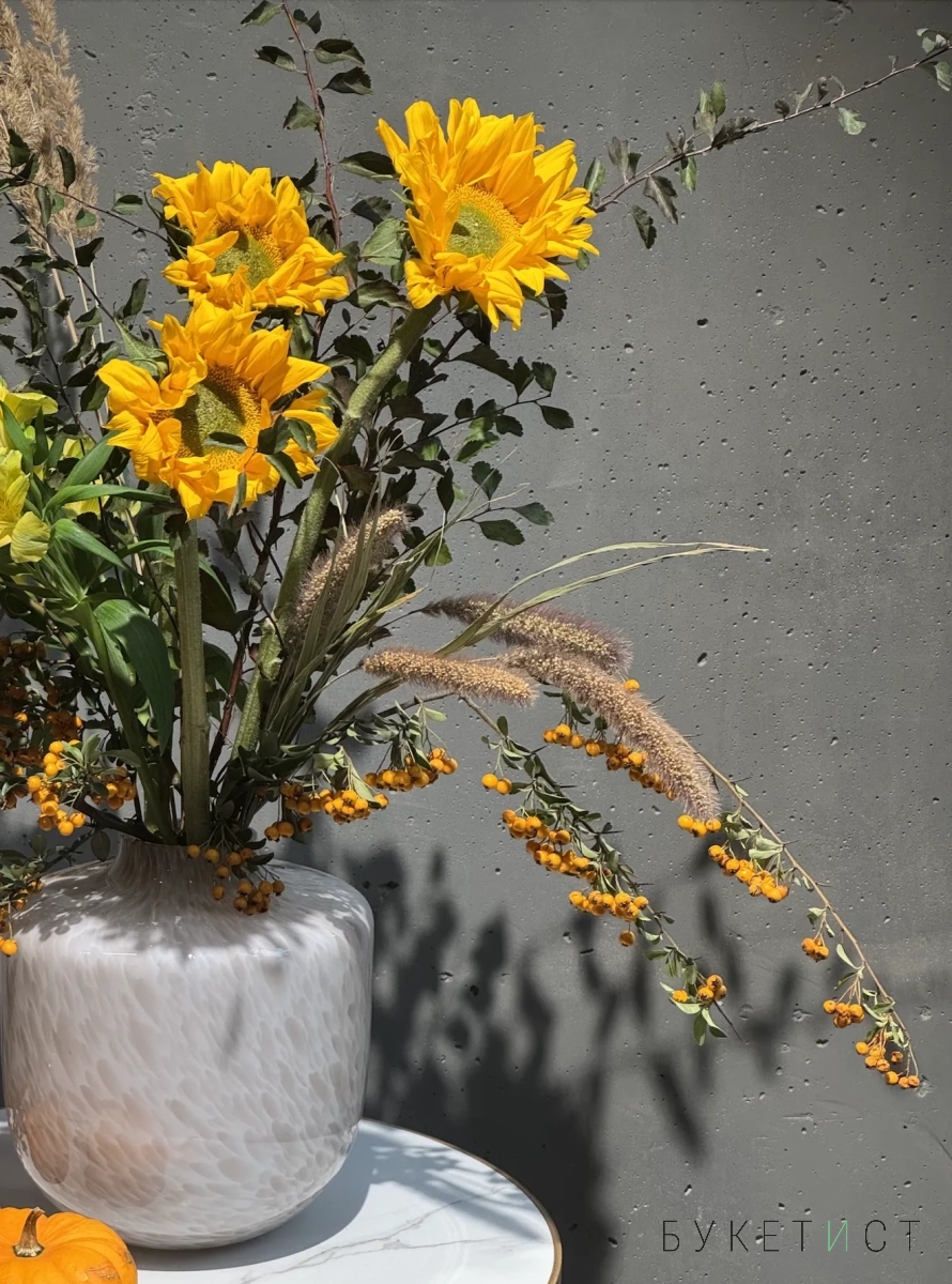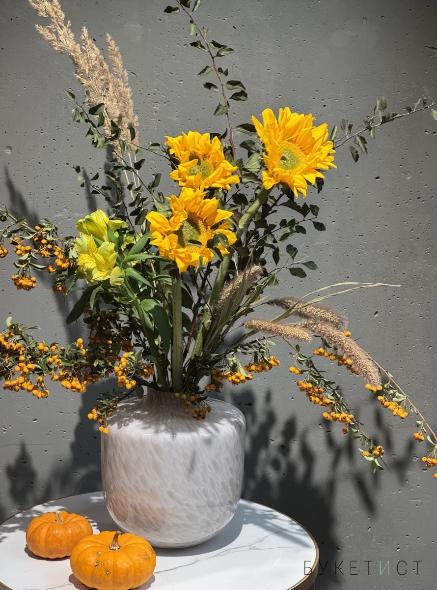 Собран из свежих цветов с выразительной фактурой и гармоничными оттенками. В состав букета входят: фермерские подсолнухи, стойкая альстромерия, пушистая сетария, веточки спиреи и ягоды пироканты.
