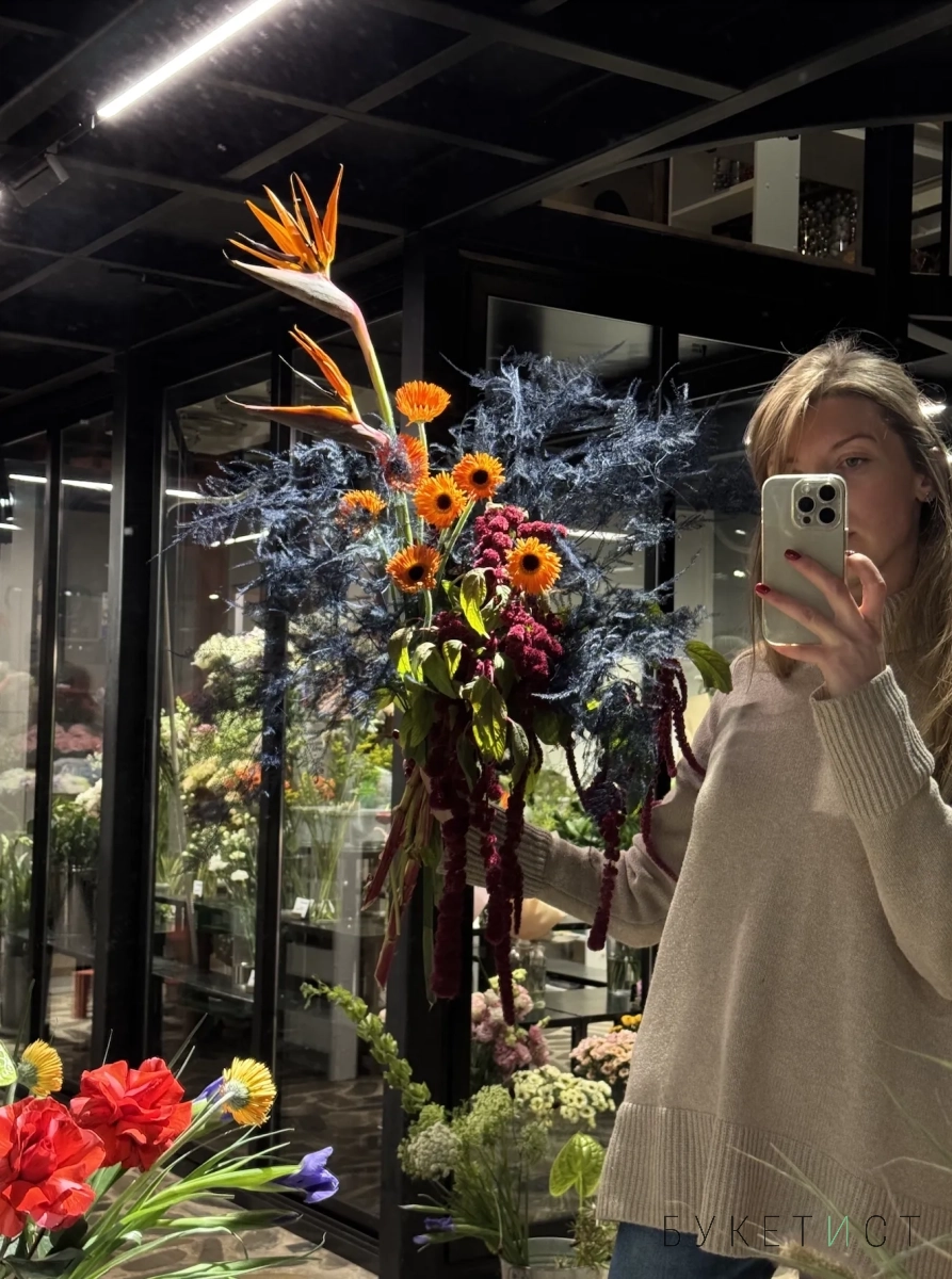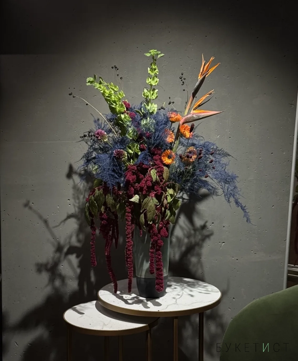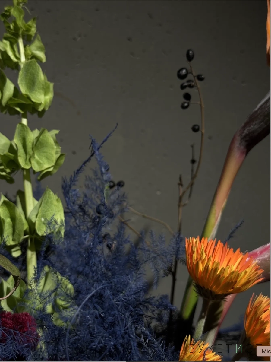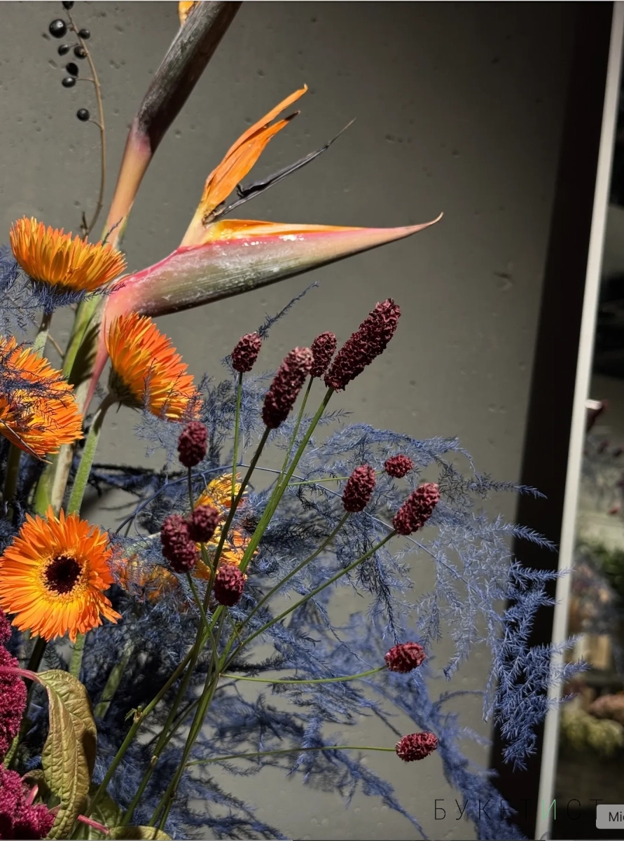 Собран из свежих цветов с выразительной фактурой и гармоничными оттенками. В состав букета входят: стрелиция - "райская птица", стойкая молюцелла, оранжевые герберы-реснички, фермерский амарант, пушистая сангисорба, соцветия аллиума, ягоды жестера и сезонный стабилизированный аспарагус.