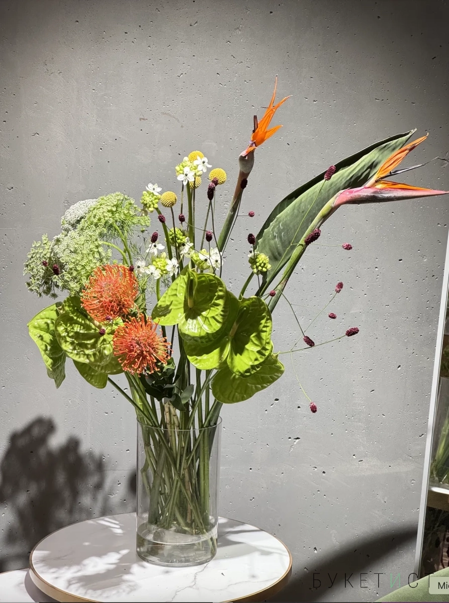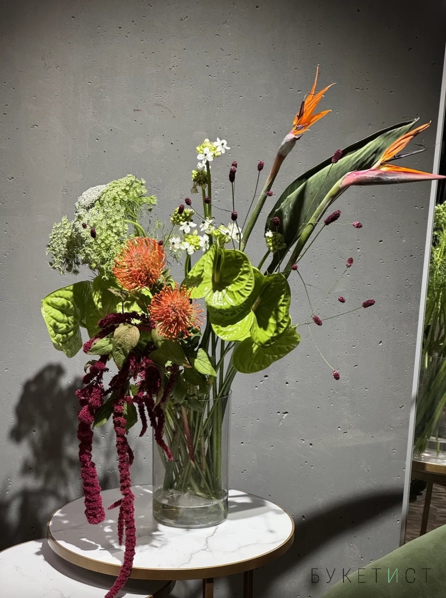 Экзотичный интерьерный букет в яркой гамме.