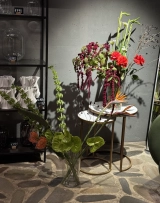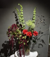 Собран из свежих цветов с выразительной фактурой и гармоничными оттенками. В состав букета входят: ажурные розы сорта Нина, стойкая молюцелла, фермерская амми, ягоды жостера и акцент из амаранта.