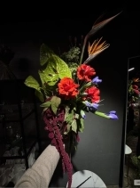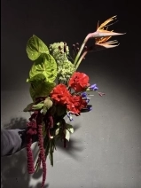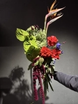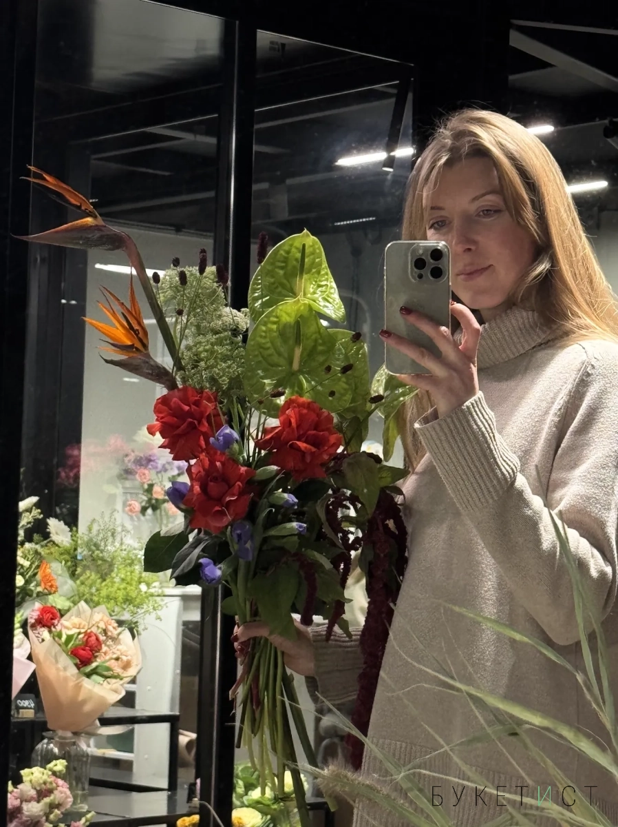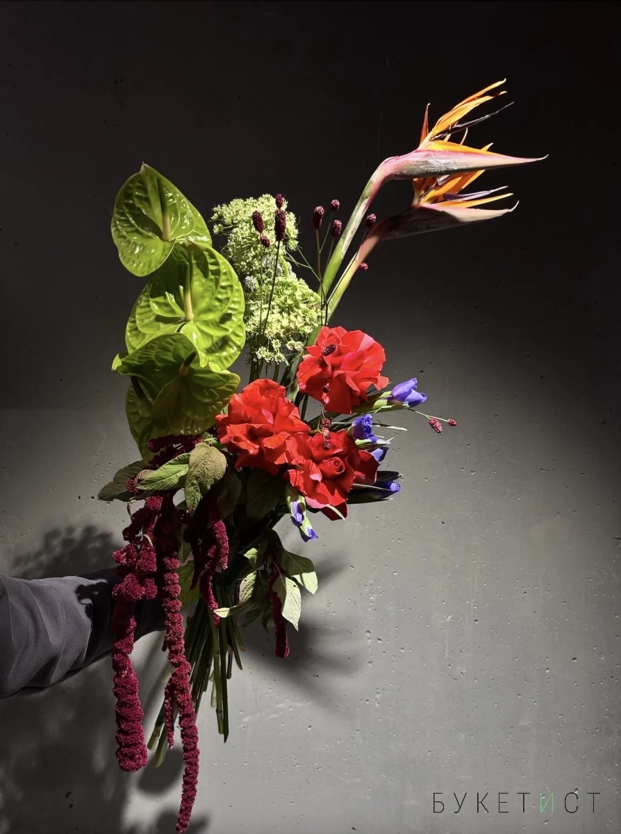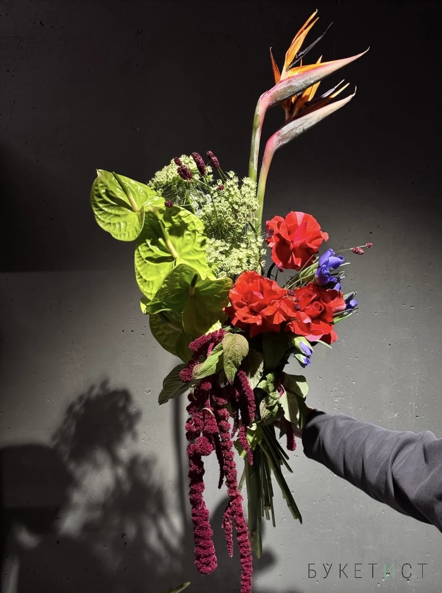 Собран из свежих цветов с выразительной фактурой и гармоничными оттенками. В состав букета входят: ажурные розы сорта Нина, экзотичный антуриум, стрелиция - "райская птица", фермерская амми, стойкие ирисы, бордовая сангисорба и акцент из амаранта.