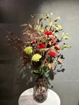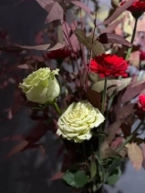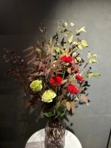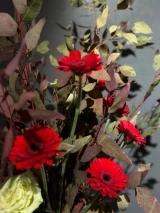 В состав композиции входят: роза сорта Лемонад, мини - гербера, фермерский красный эвкалипт. Подходит для украшения дома, офиса или в подарок.
