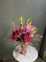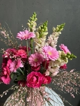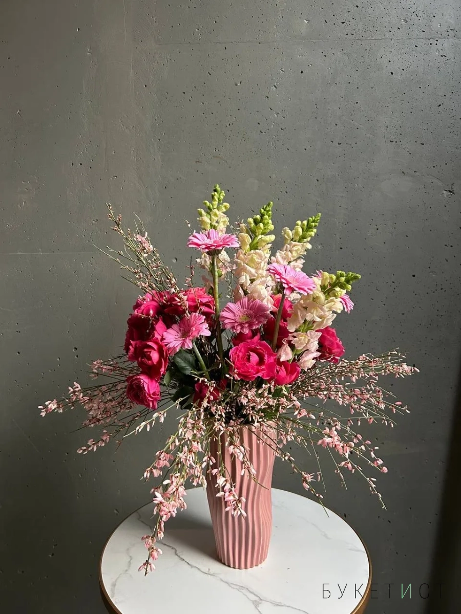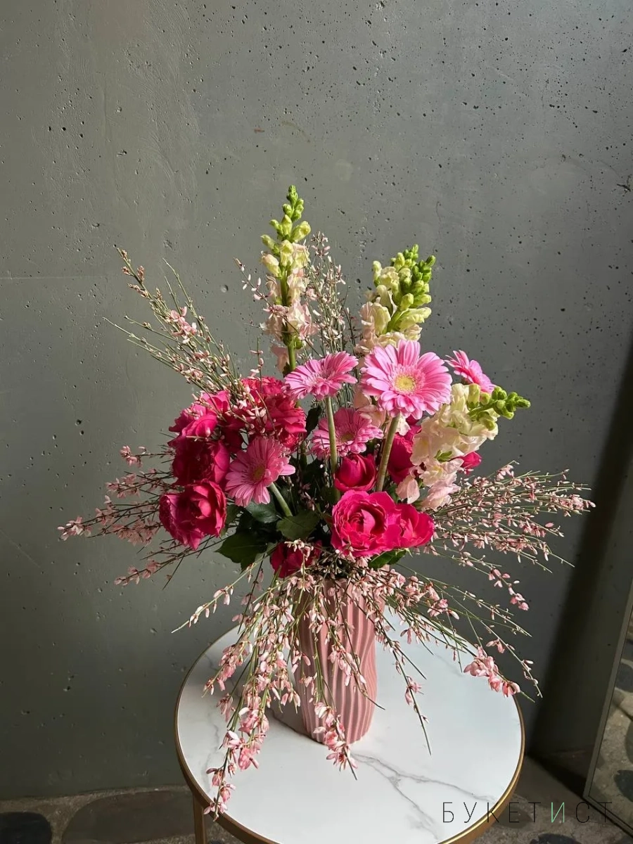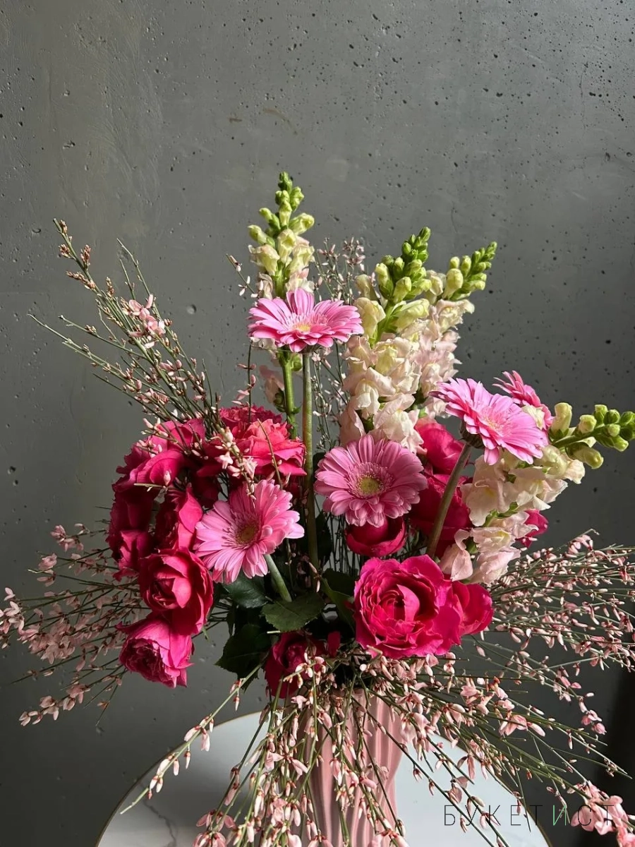 В состав композиции входят: Кустовая пионовидная роза сорта Джульетта Серайз, леувенбек, мини - гербера, ароматная гениста. Подходит для украшения дома, офиса или в подарок.