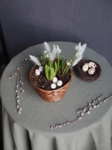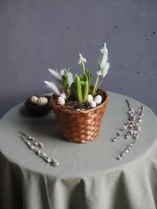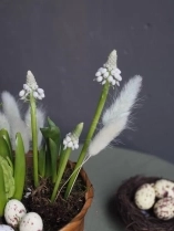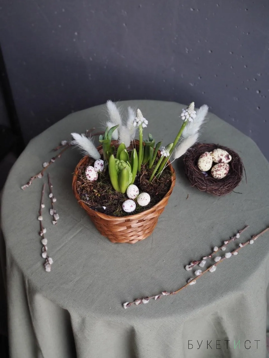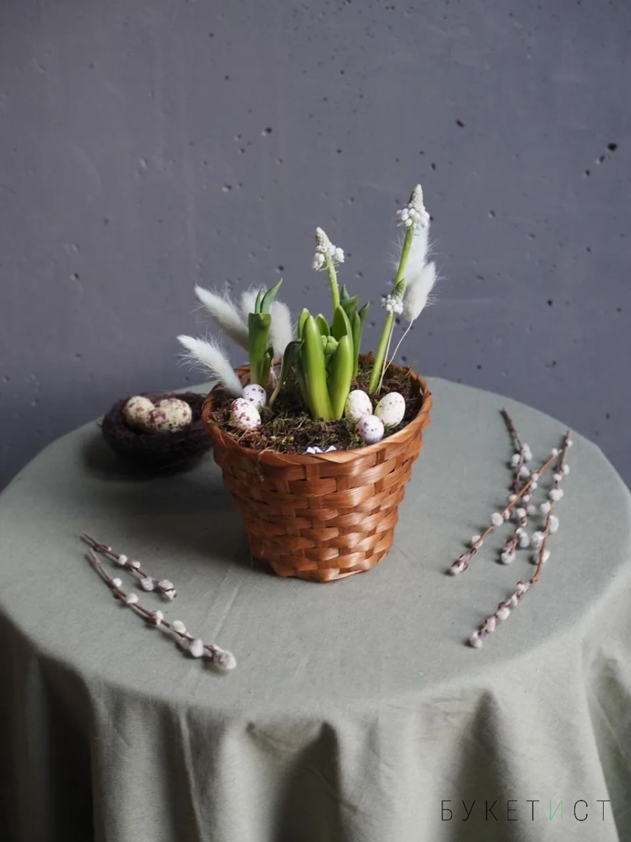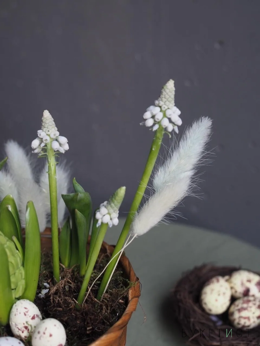 Композиция сочетает в себе луковицы гиацинтов, тюльпанов, мускари и декоративные яйца-бусины.