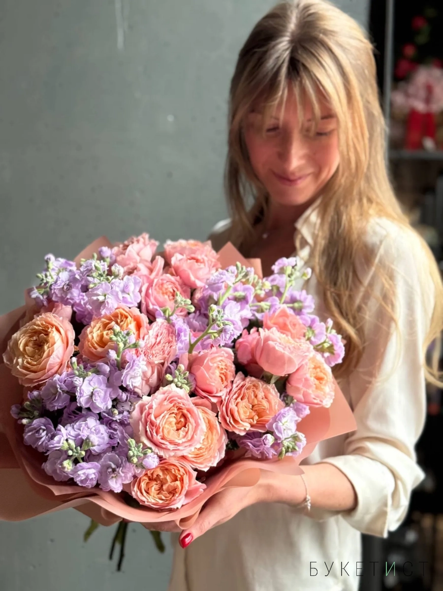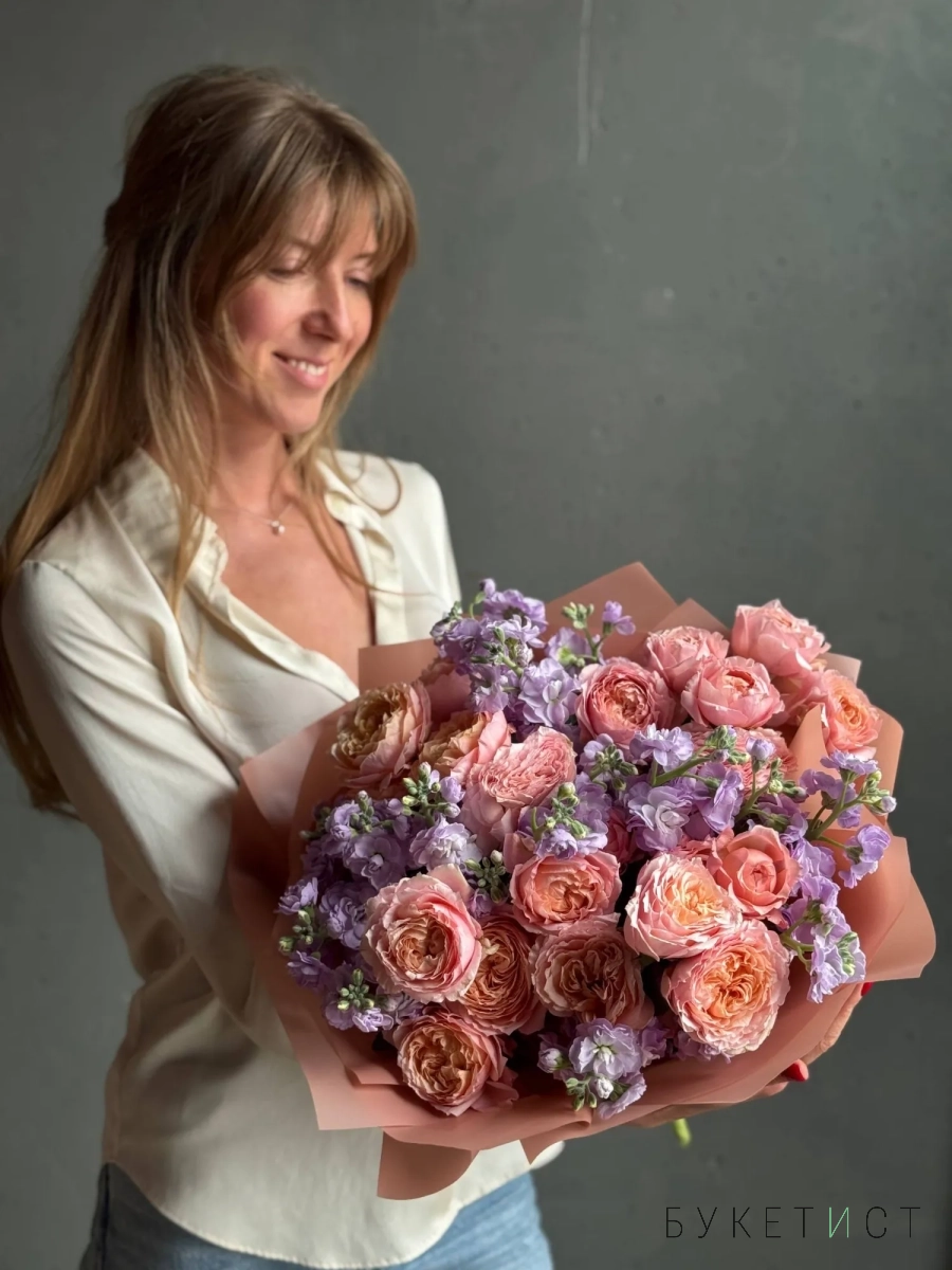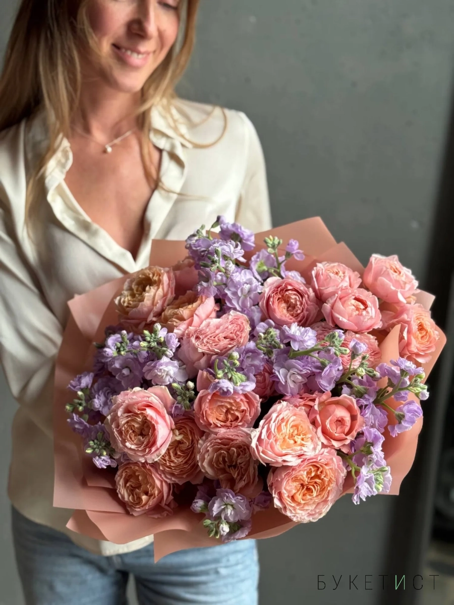 Букет пионовидных роз Джульетта с маттиолой