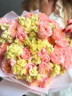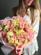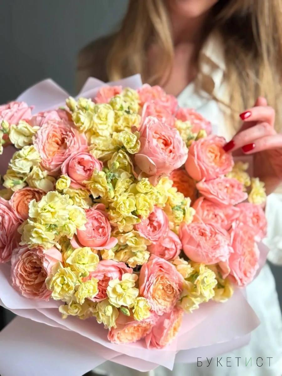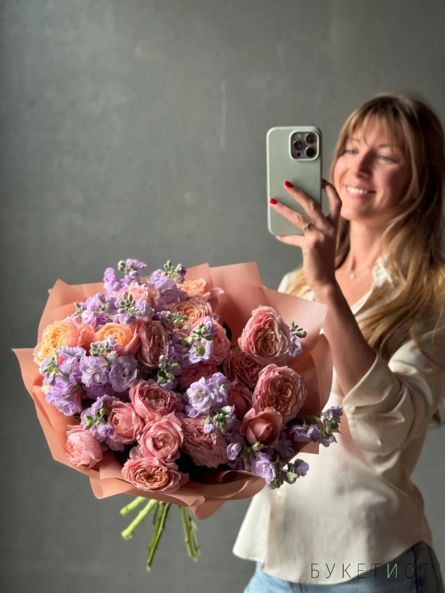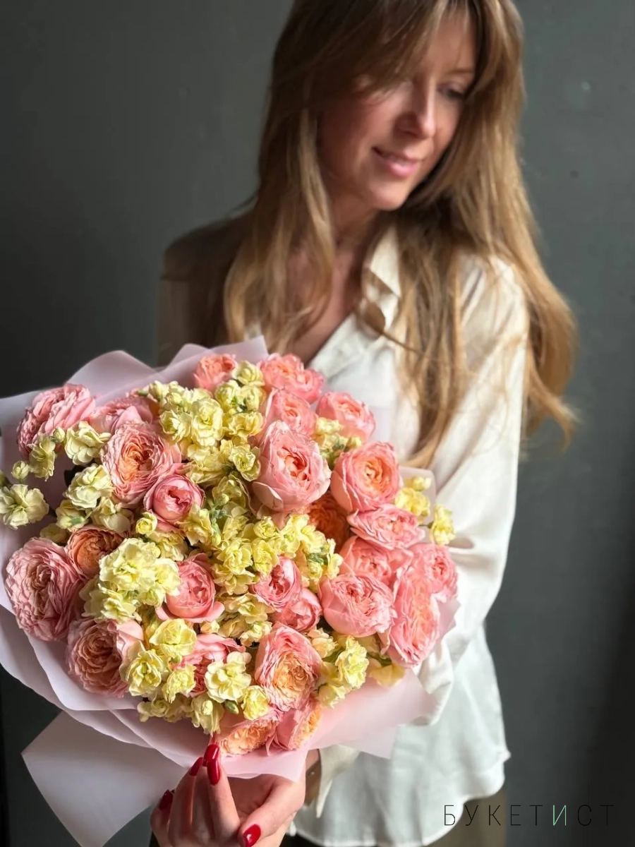Букет пионовидных роз Джульетта с маттиолой