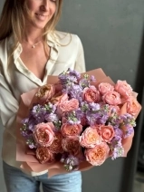 Авторский букет с кустовой маттиолой и кустовой пионовидной розой Джульетта. На фото представлен букет из 11 стеблей.