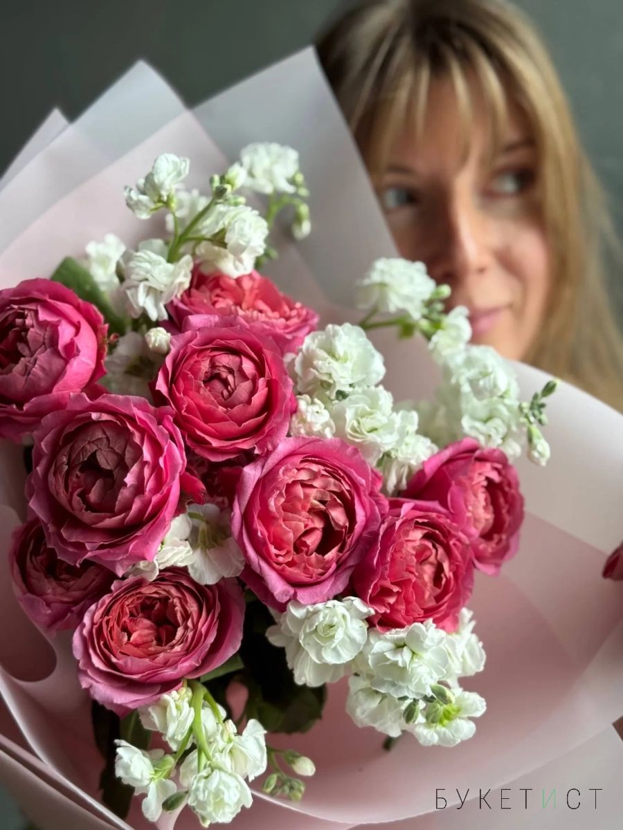 Яркие пионовидные розы с маттиолой