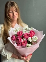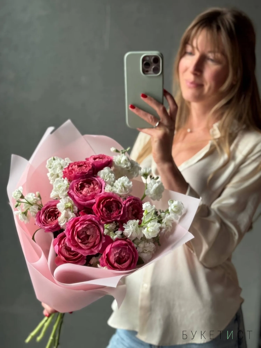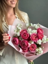 Авторский букет с кустовой маттиолой и кустовой пионовидной розой Мисти Баблз. На фото представлен букет из 7 стеблей.
