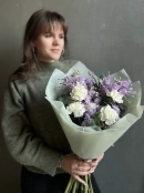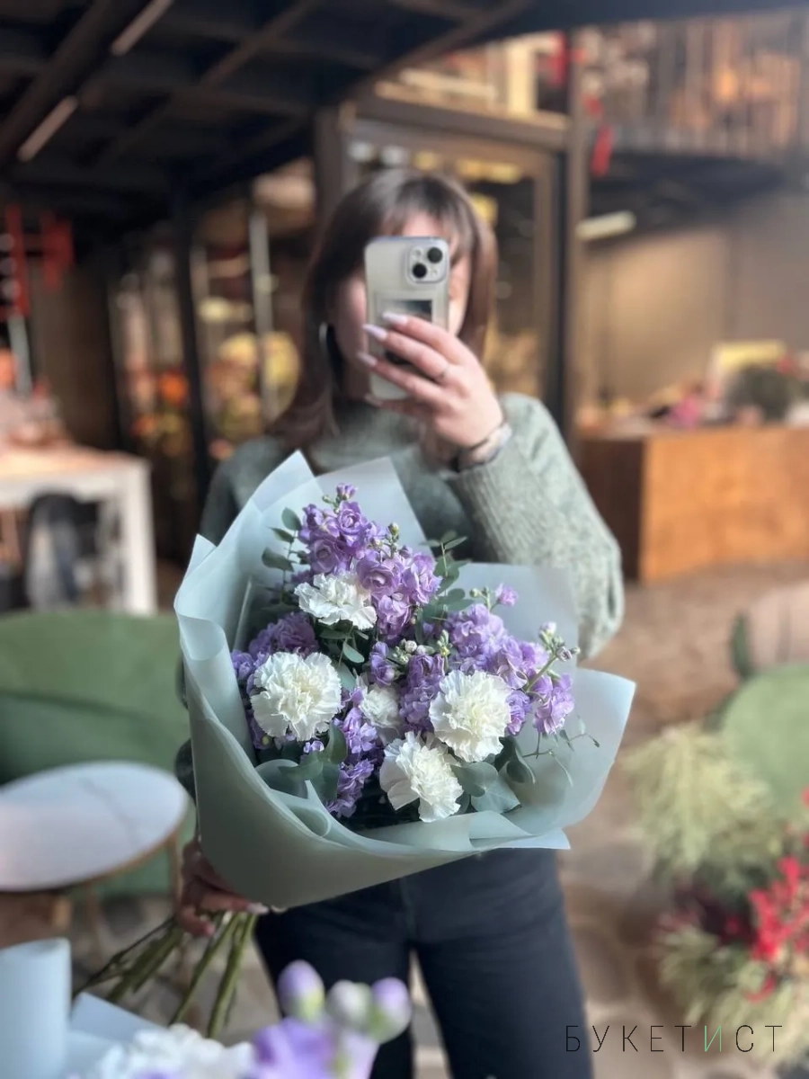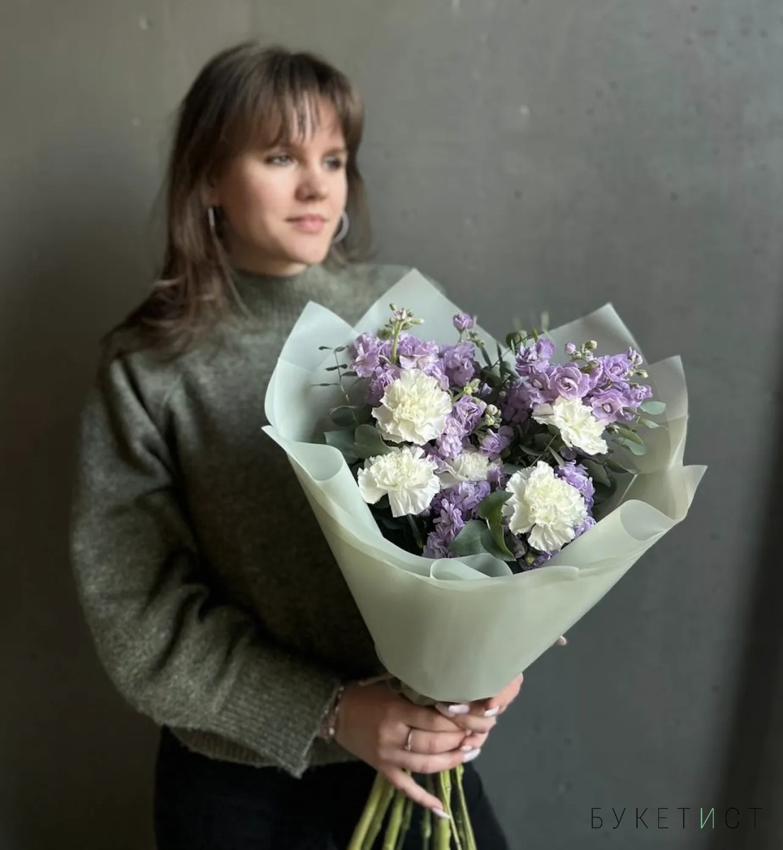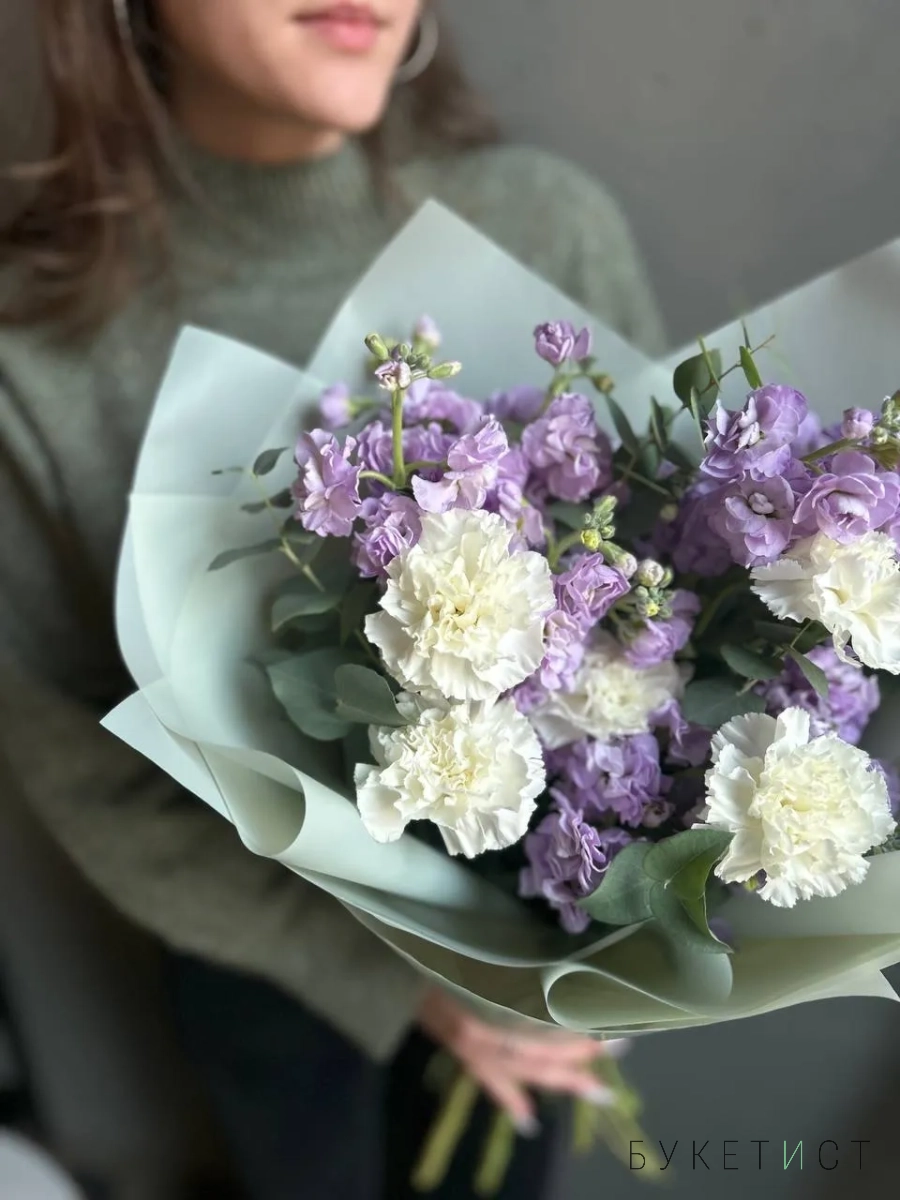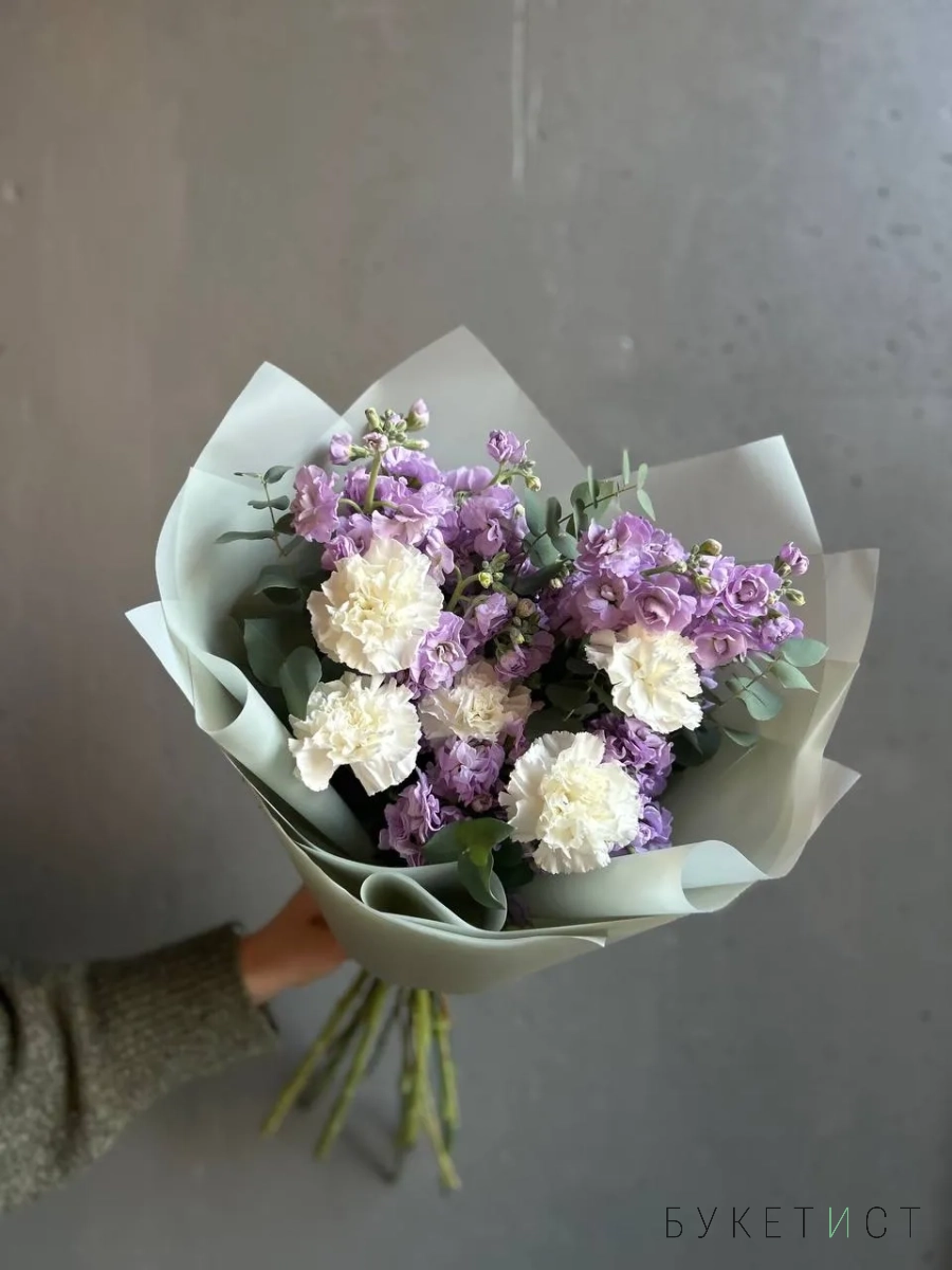 Авторский букет с лавандовой маттиолой, белоснежной гвоздикой и эвкалиптом.