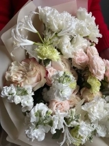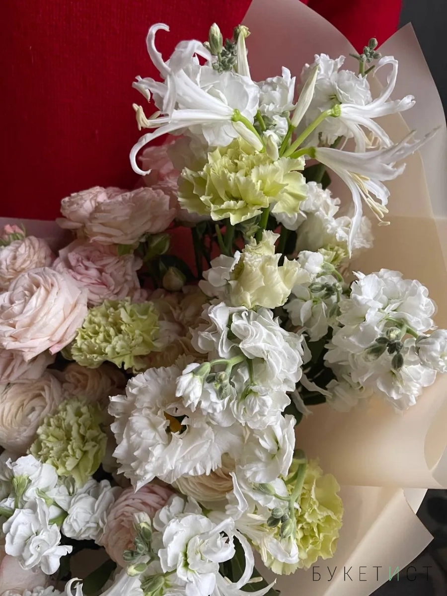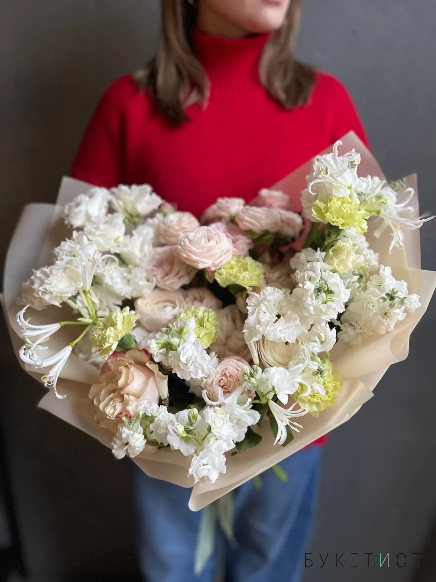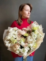 Букет с ароматной маттиолой и пионовыми розами