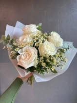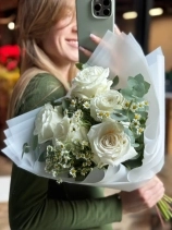 Авторский букет с белоснежными розами сорта Плайя Бланка, танацетумом и эвкалиптом.