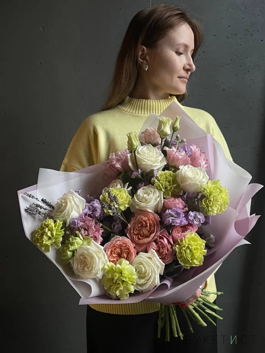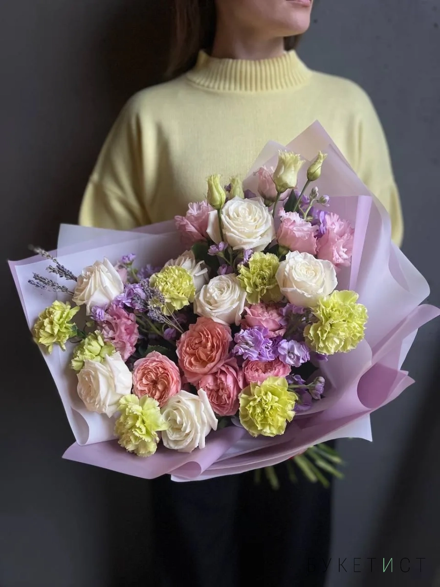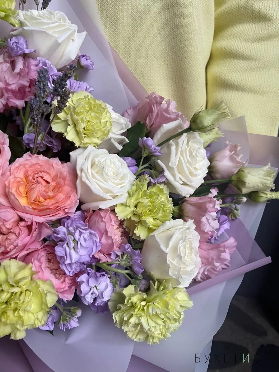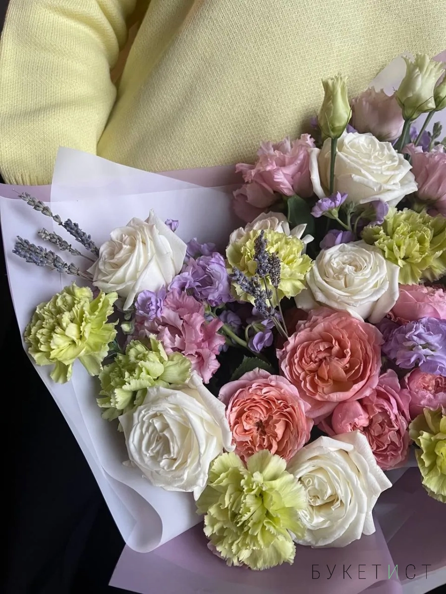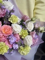 Авторский букет с кустовой маттиолой, пионовидной розой сорта Джульетта, одноголовыми розами Плайа Бланка, диантусами в нежно-зеленом оттенке, эустомой и лавандой.