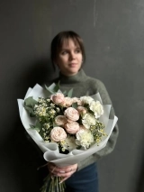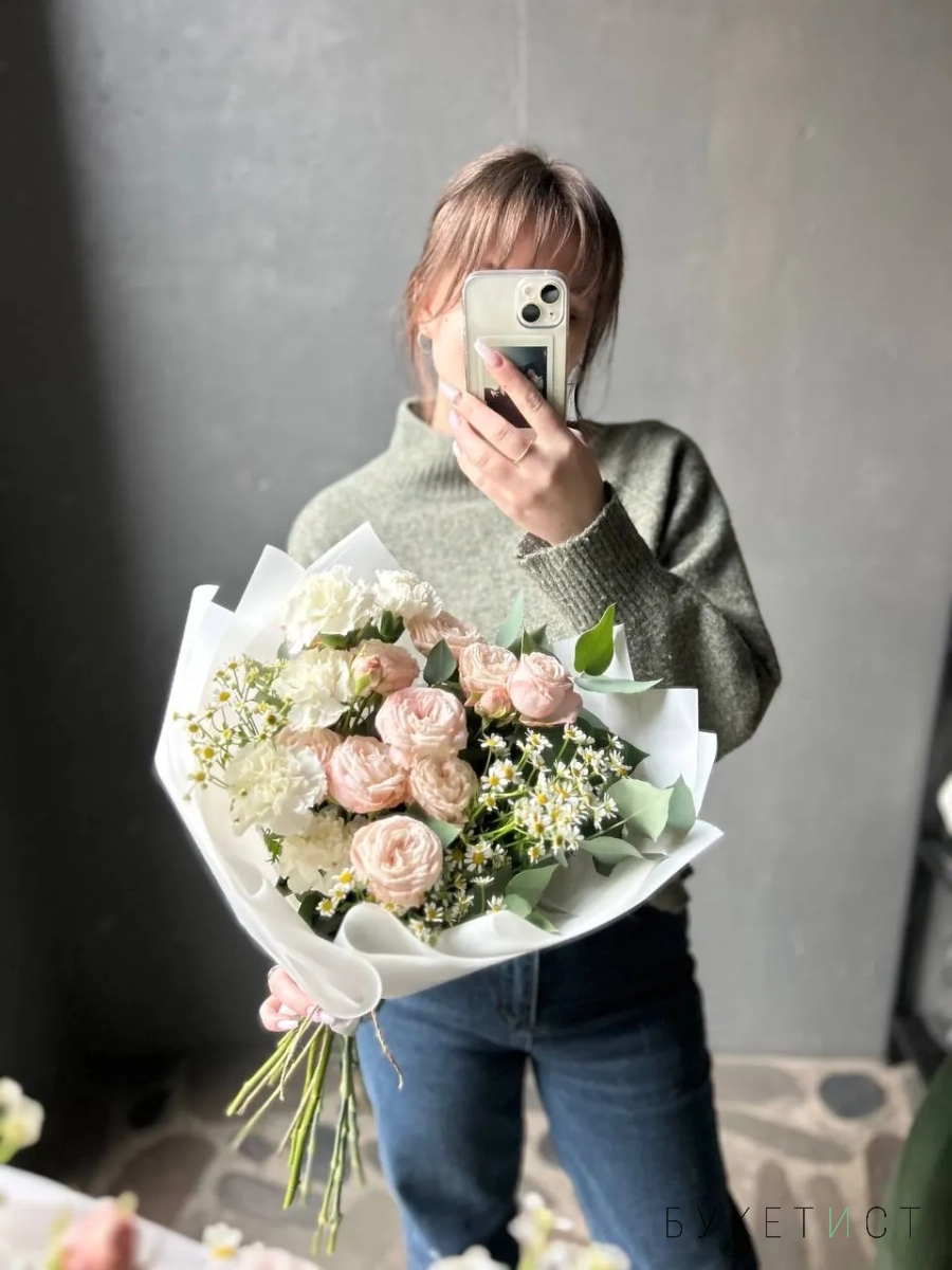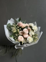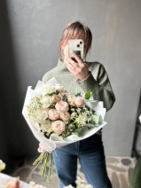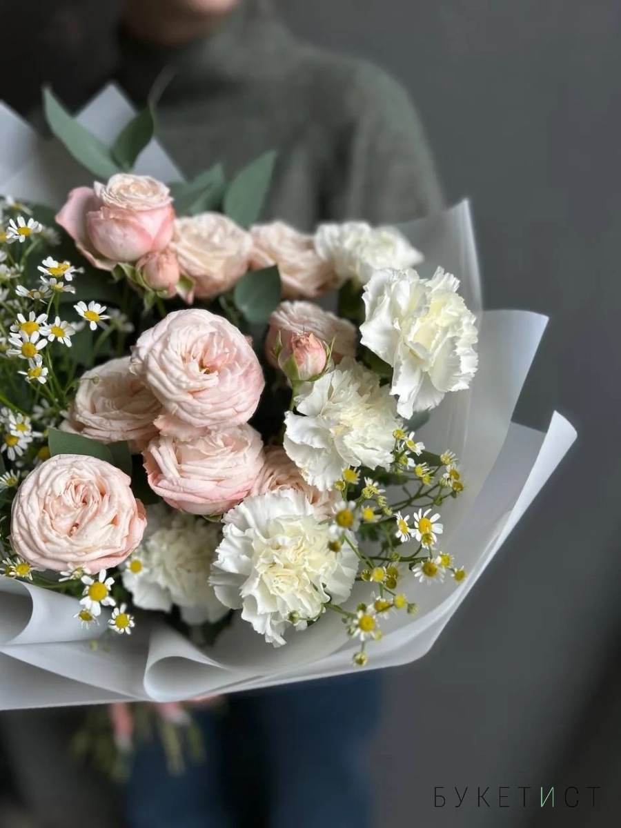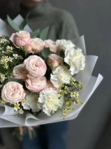 Авторский букет с нежными пионовидными розами сорта Бомбастик, белыми гвоздиками, танацетумом и эвкалиптом.