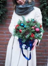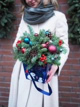 Живые ветви ароматной ели устанавливаются в специальный материал, пропитанный водой - это позволяет изделию держать форму и сохранять свежесть как можно дольше. Украшения аккуратно крепим на специальный клей (не обходится и без особой флористической магии, конечно).