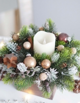 Живые ветви ароматной ели устанавливаются в специальный материал, пропитанный водой - это позволяет изделию держать форму и сохранять свежесть как можно дольше. Украшения аккуратно крепим на специальный клей (не обходится и без особой флористической магии, конечно).