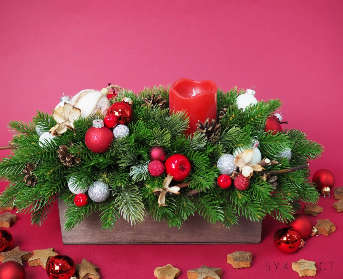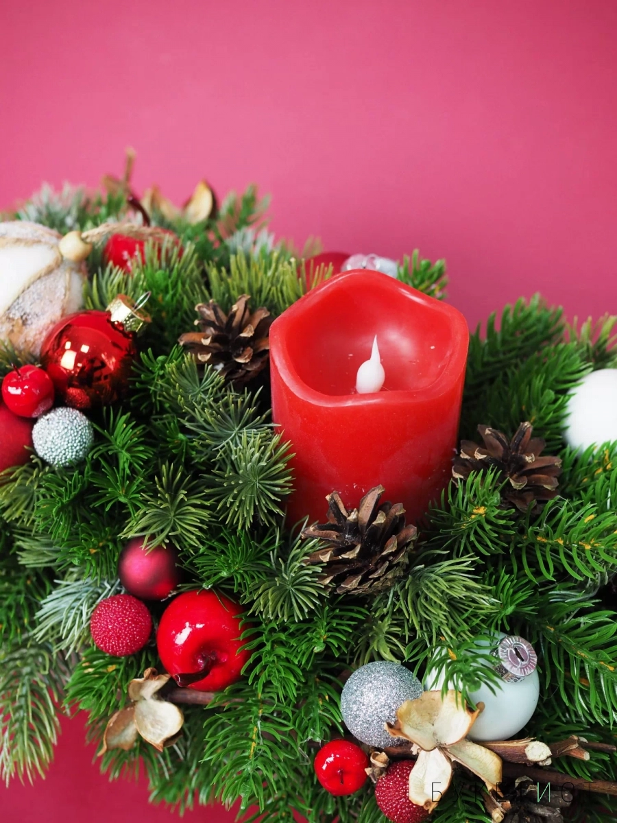 Каждая композиция создаётся заботливыми руками наших фей-флористов: живые ветви ароматной ели устанавливаются в специальный материал, пропитанный водой - это позволяет изделию держать форму и сохранять свежесть как можно дольше. Свечи добавляют особого волшебства - совсем как в рождественском кино ❤️