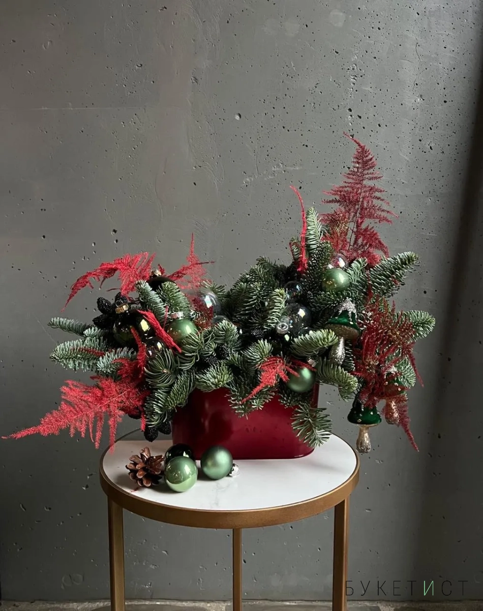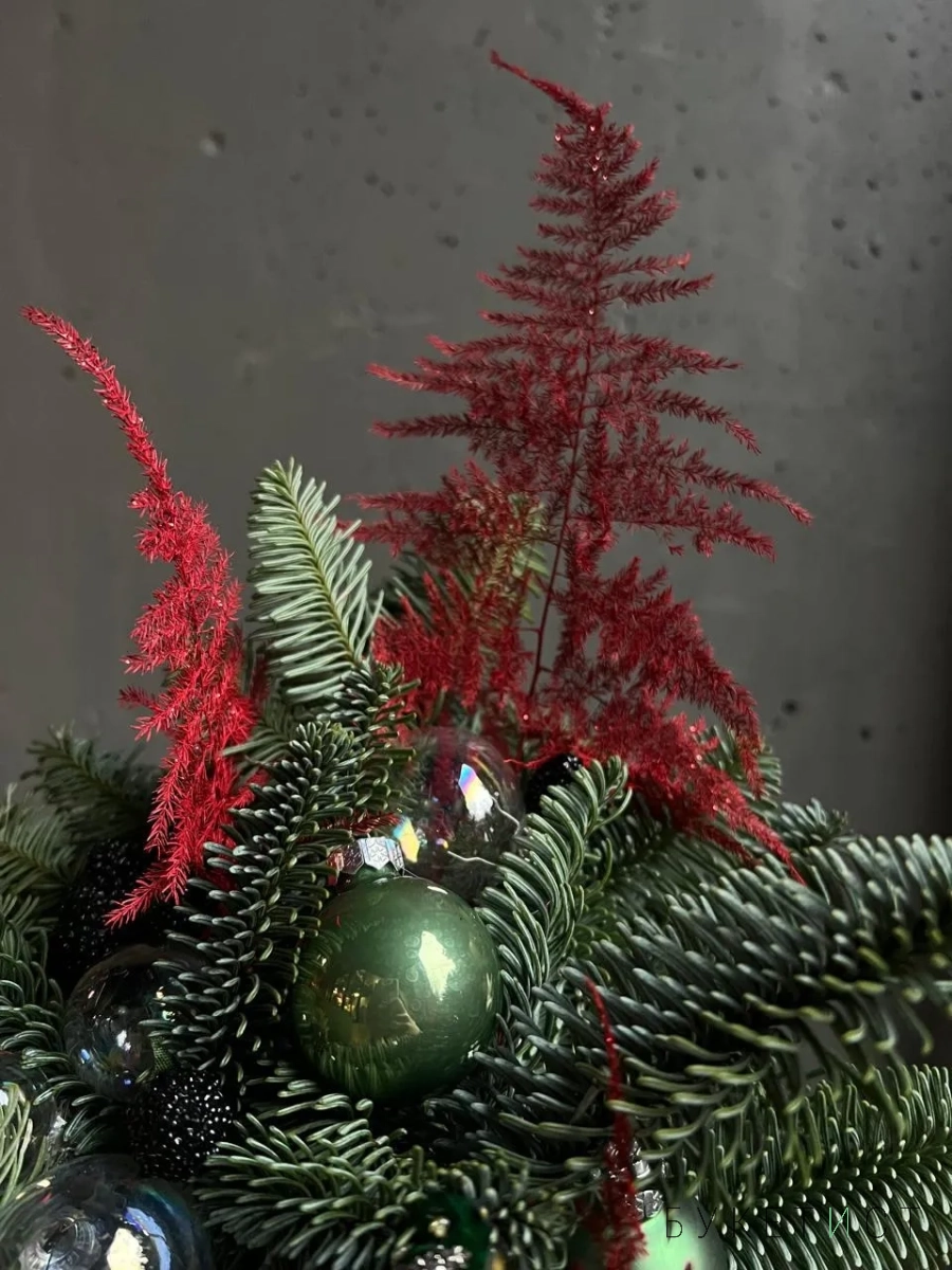 Каждая ёлочка создаётся волшебными руками наших фей-флористов: живые ветви ароматной ели устанавливаются в специальный материал, пропитанный водой - это позволяет изделию держать форму и сохранять свежесть как можно дольше. Украшения аккуратно крепим на специальный клей - уровень эстетического удовольствия просто зашкаливает ❤️