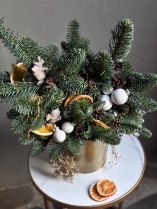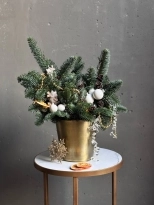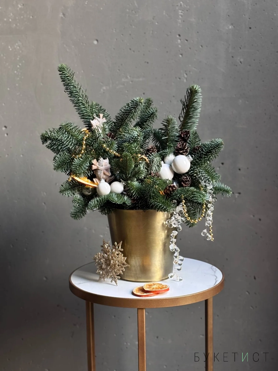 Еловая композиция в золотом кашпо "Ежик на коньках"