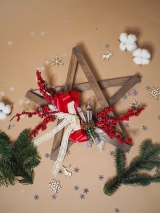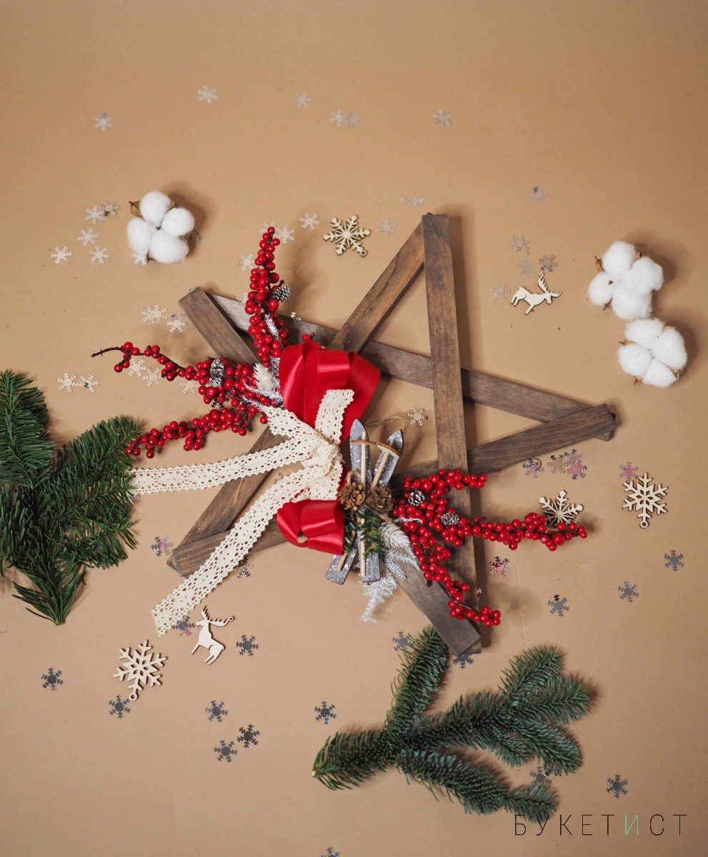 Интерьерная деревянная фигурка в форме звёзды ручной работы, украшенная праздничным декором.