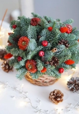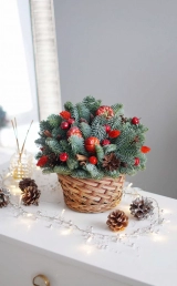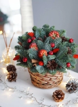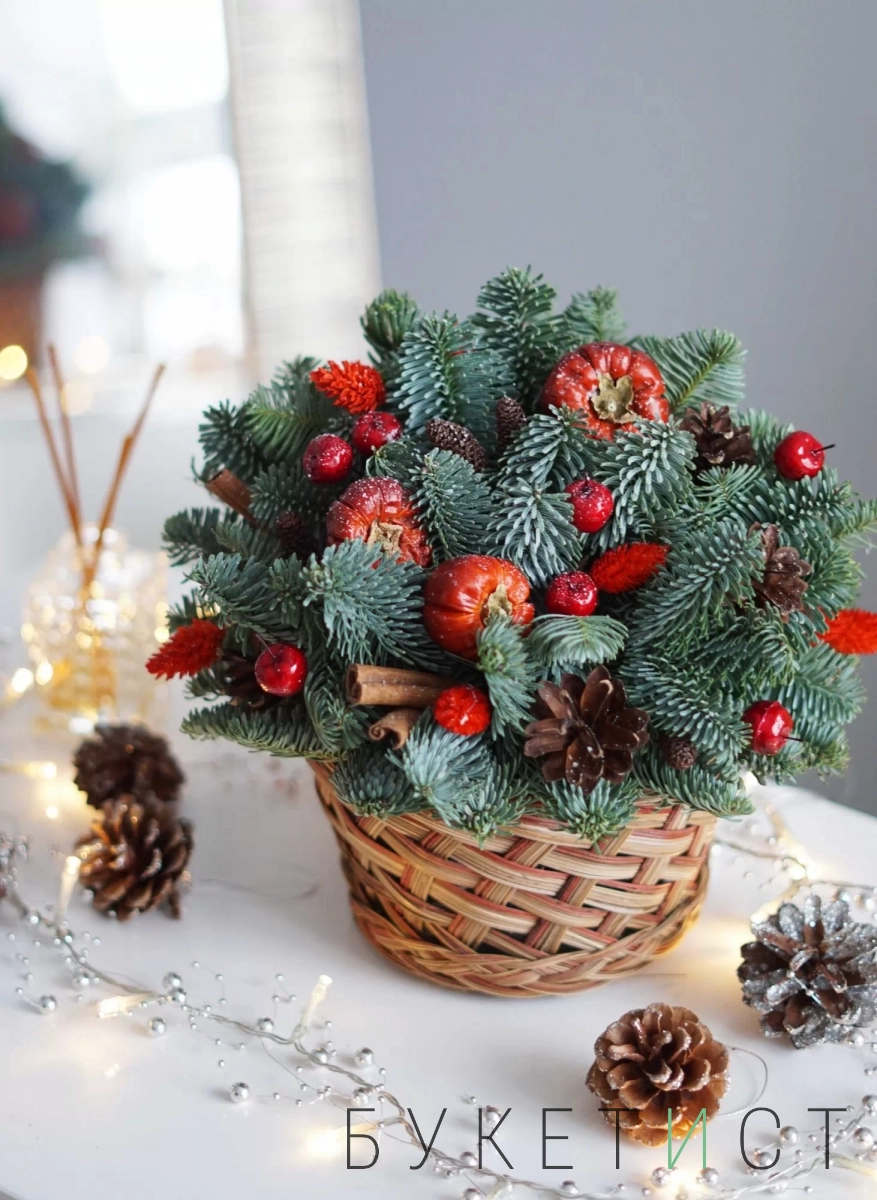 Композиция из живой ели с корицей, шишками и острым перчиком в плетеном кашпо